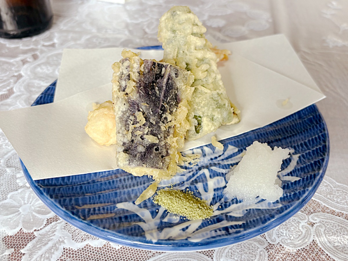 揚げたての天ぷらは、抹茶塩または大根おろしの天つゆでいただくスタイル。