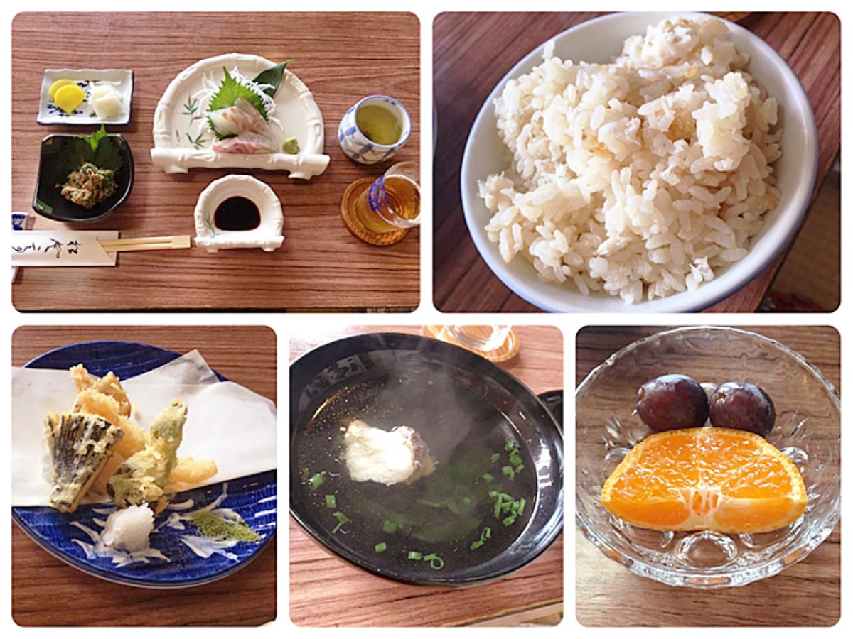 2,200円のお昼のセットでも、お刺身、小鉢、香の物、天ぷら、お汁、鯛めし、フルーツと十分な内容。