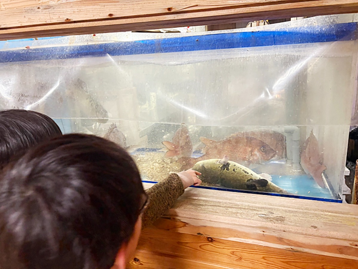 鯛やフグなど、様々な種類の泳ぐ魚たちに、またまた子どもたちのテンションMAX。