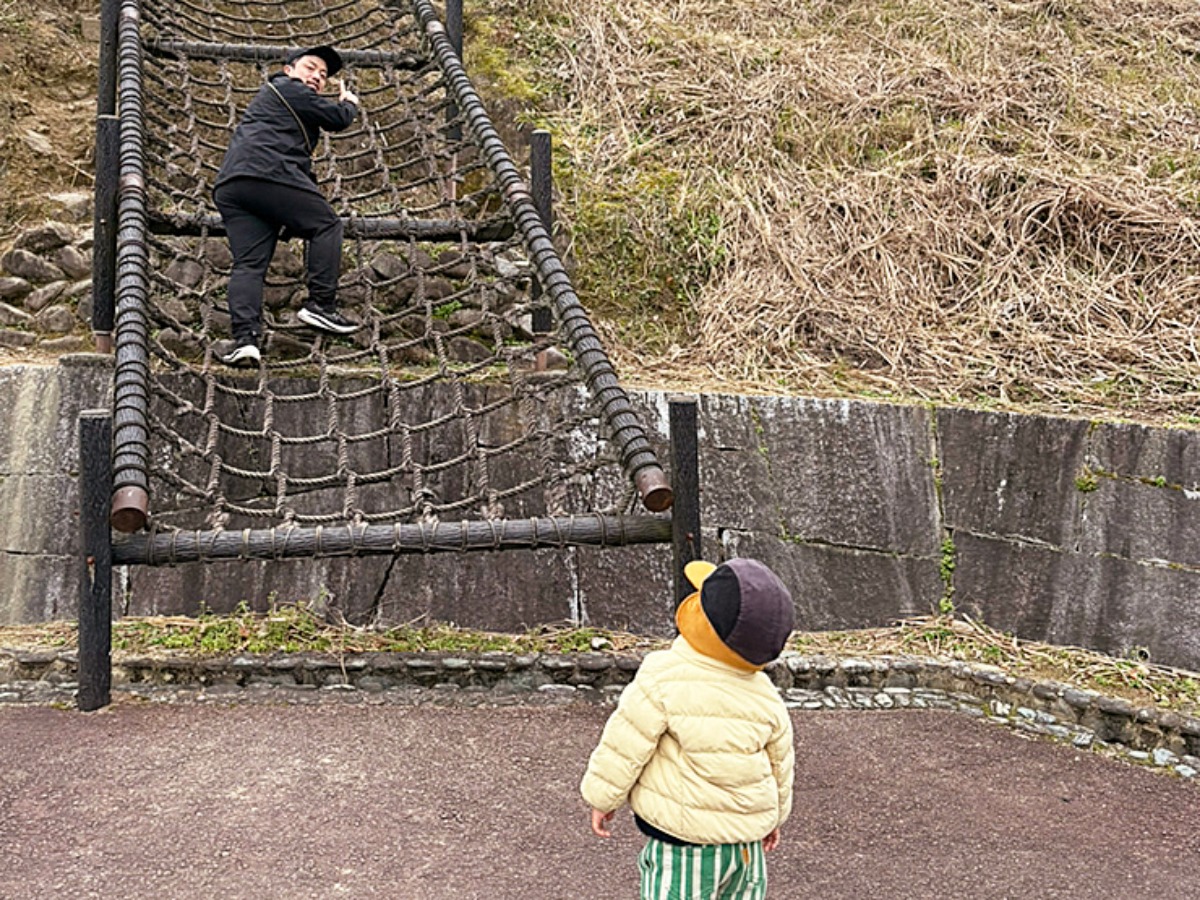 網の遊具を登ると近道!?とと挑戦!息子は「ととすごいーっ」と少し心配そうに見ていました。笑