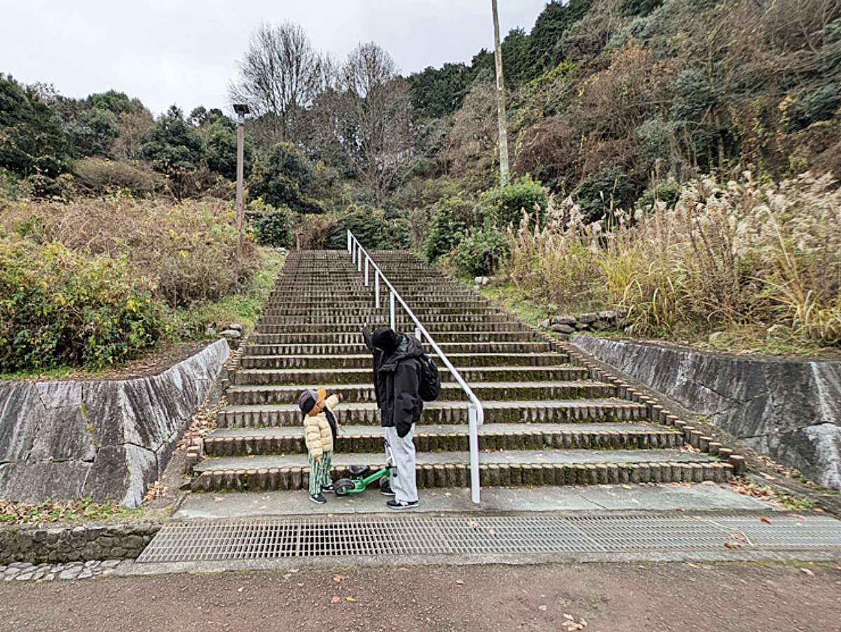長い階段が続きます…が、キックバイクをかかに託して息子はどんどん登っていきました!