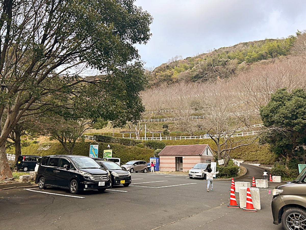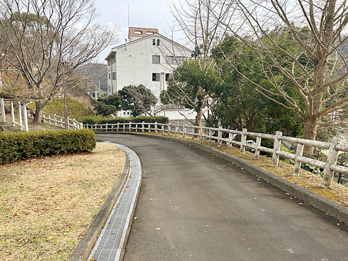 看板を見てすぐ左に曲がり、運動場に向かう下り道と、右に登る別れ道があるので、少し登る道を進むとすぐに駐車場が見えてきます。