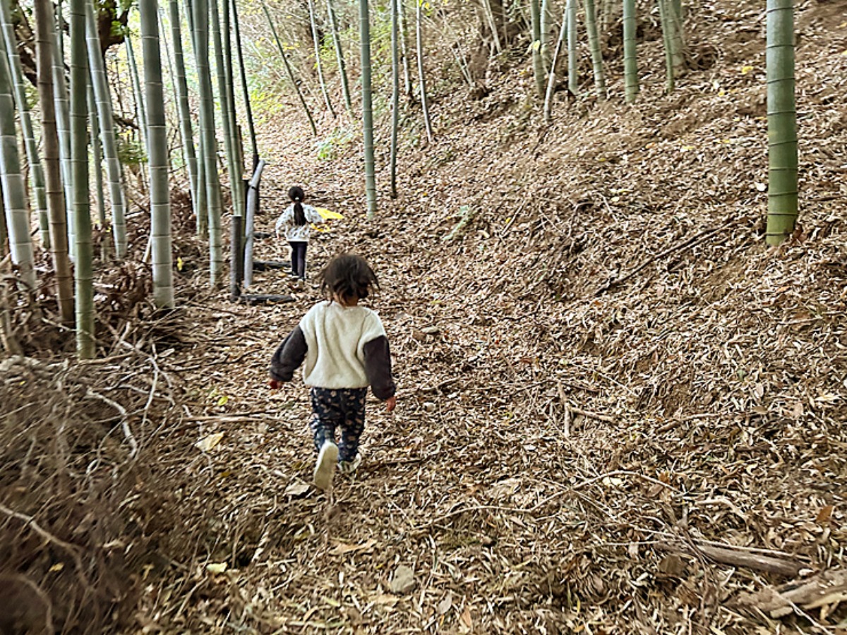 ちょっとした山の中も歩いたりも出来るので、探検しようと子どもたちはどんどん進んでいきます。5歳児2人について行くのはとても至難の業です。