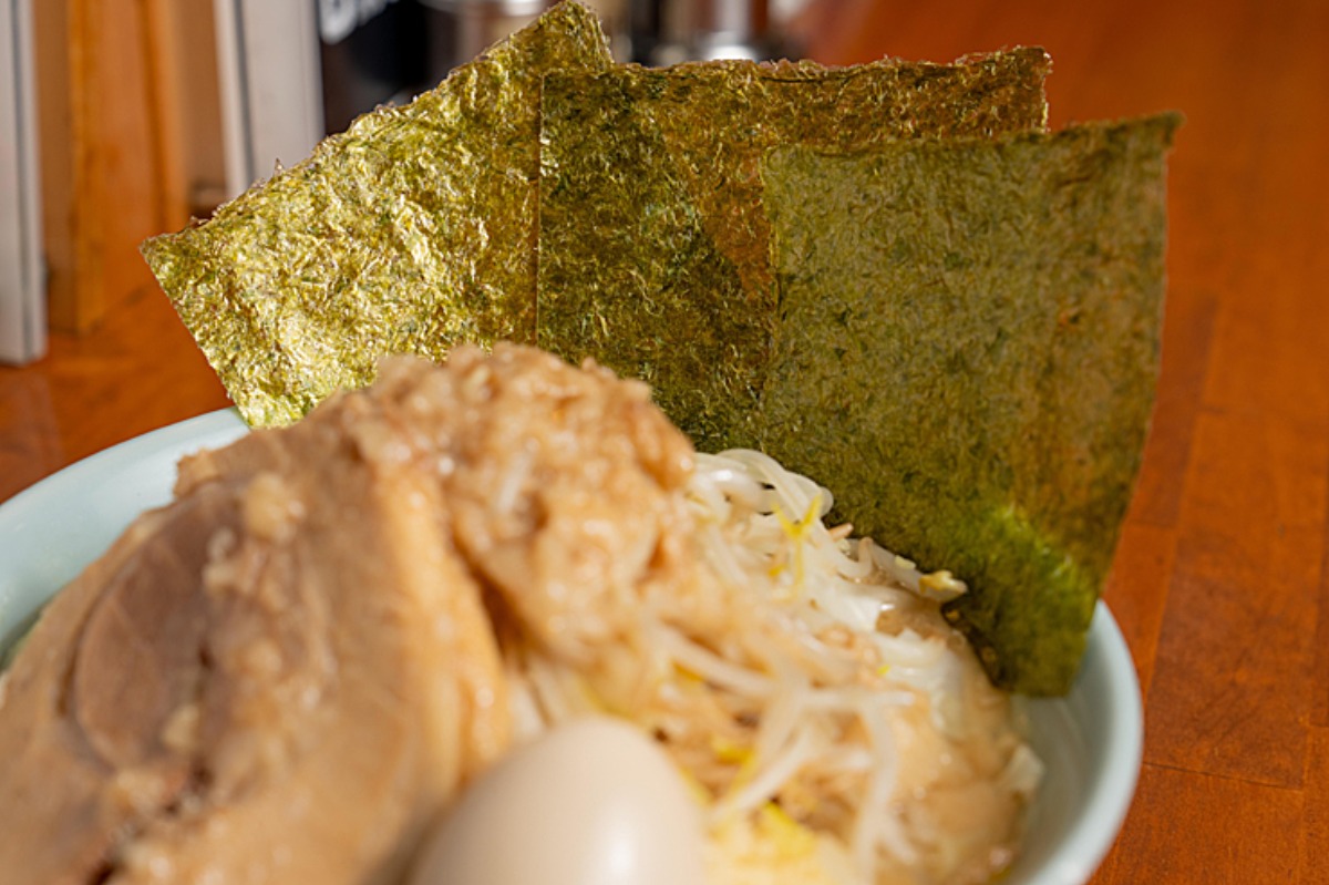 写真映えナンバーワンのトッピング。大きな海苔3枚が、食欲をさらにかき立ててくれる。