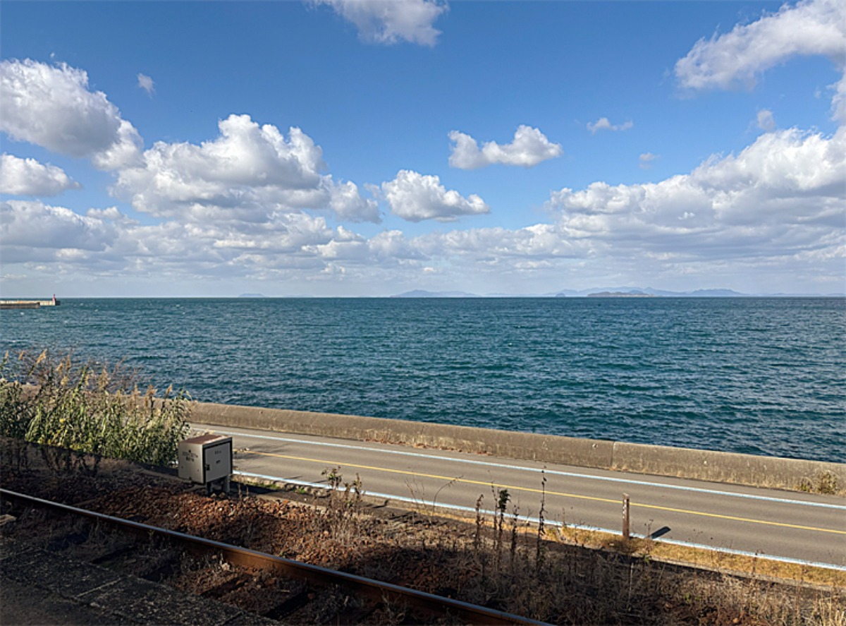 下灘駅のホームからは、目の前に広がる海と大きな空を一望できます。線路や道路のすぐ向こうに海があり、駅にいることを忘れてしまうような景色でした。