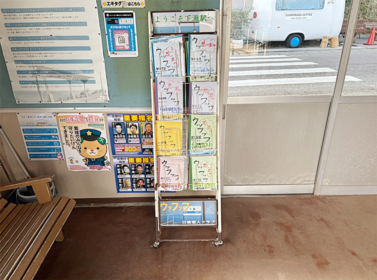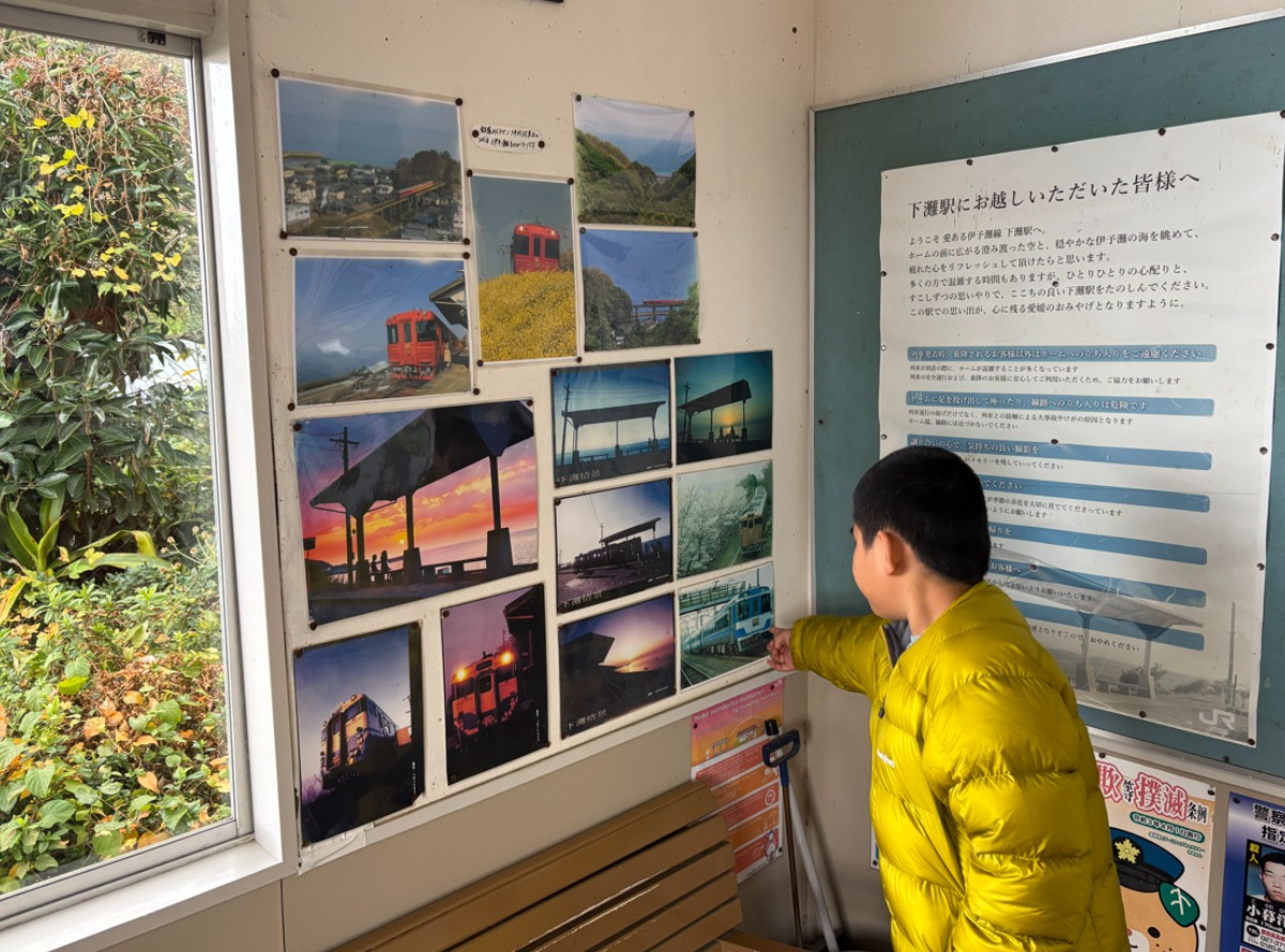 駅の中には、下灘駅の風景や出来事を伝える写真や展示物が並んでいます。