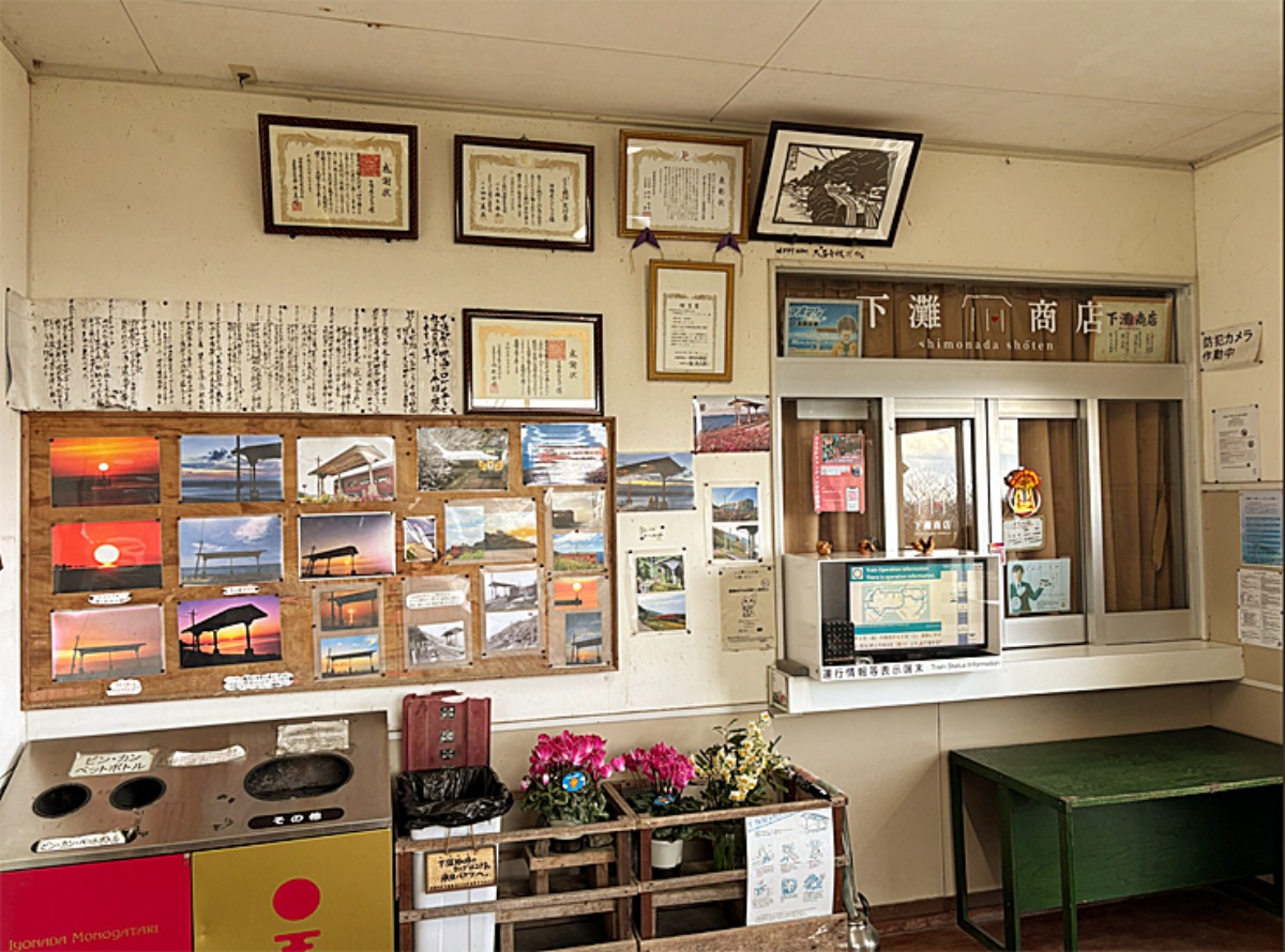 駅内には、夕陽の写真や歴史を伝える掲示があり、訪れる人が楽しめる空間になっています。