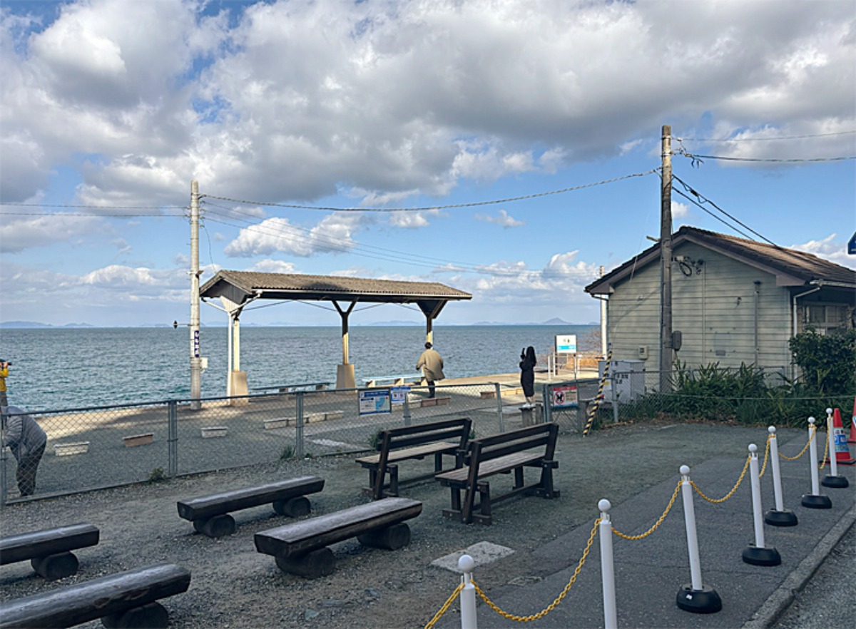 ベンチが用意され、訪れた人が立ち止まり、駅と海の景色を楽しめるようになっています。