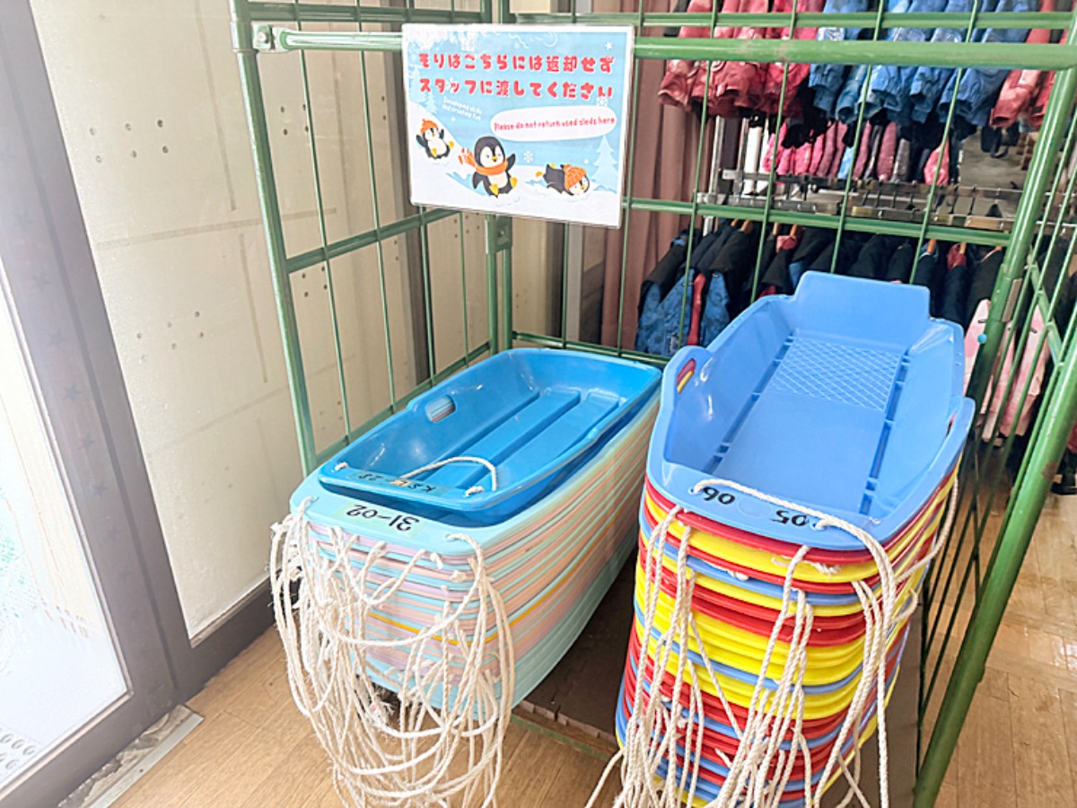 今回は防寒対策としてニット帽だけ持参し、子ども用の雪遊びセット(そり・ウェア・グローブ・長靴)を借りました。