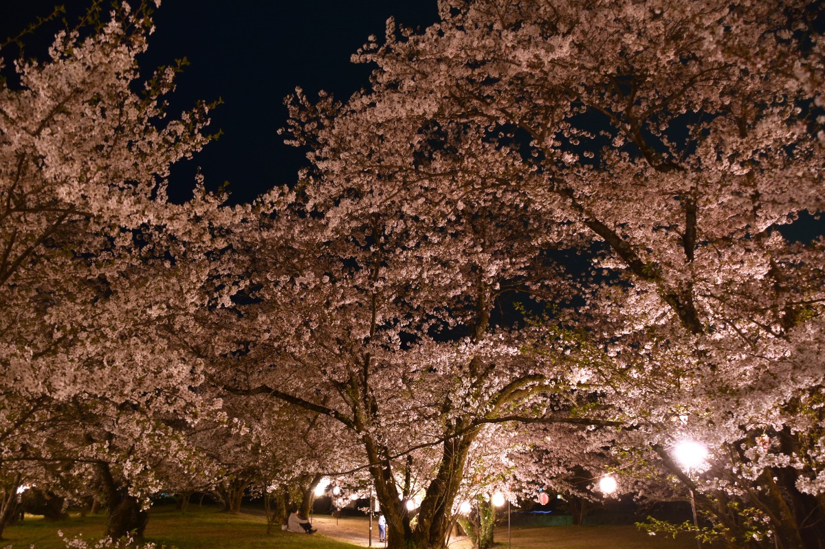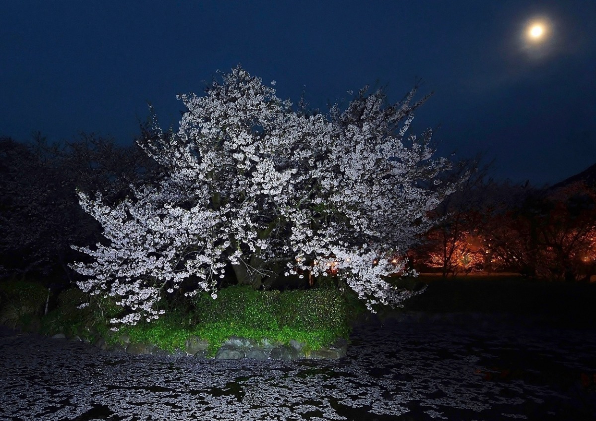 四国中央フォトコンテスト第14回大会のグランプリに選ばれた、大高久昌さんの「闇夜に浮かぶ桜」は、「すすきヶ原入野公園」の桜を撮影したものです。満開の桜は迫力があって美しいですが、散った桜が地面や水面にピンクの絨毯を広げる様も美しい光景ですよね。