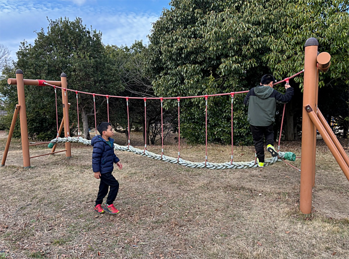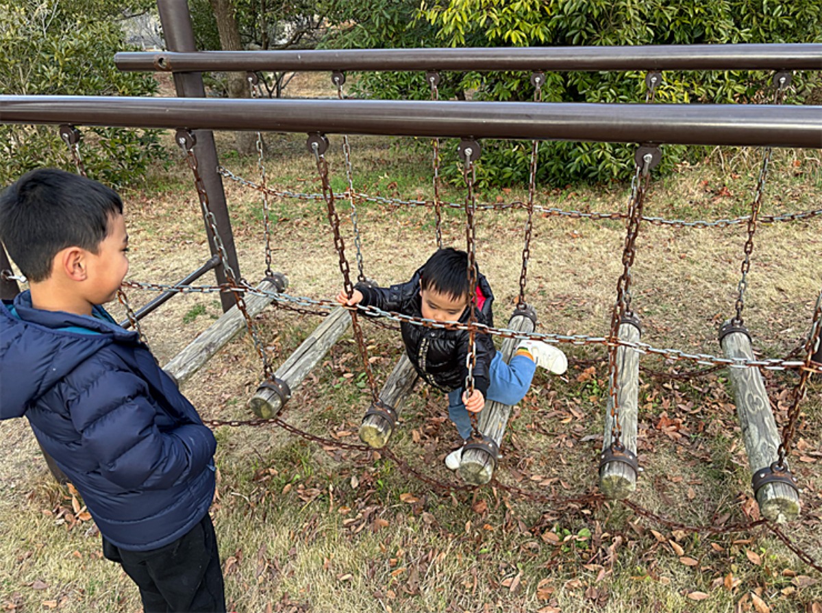実はバランス系の遊具が少し苦手な長男。そんな長男に、次男が「頑張れー!」と声をかけて、応援していました。思わず「逆じゃない?」と思いましたが、これも兄弟ならではの光景ですね。