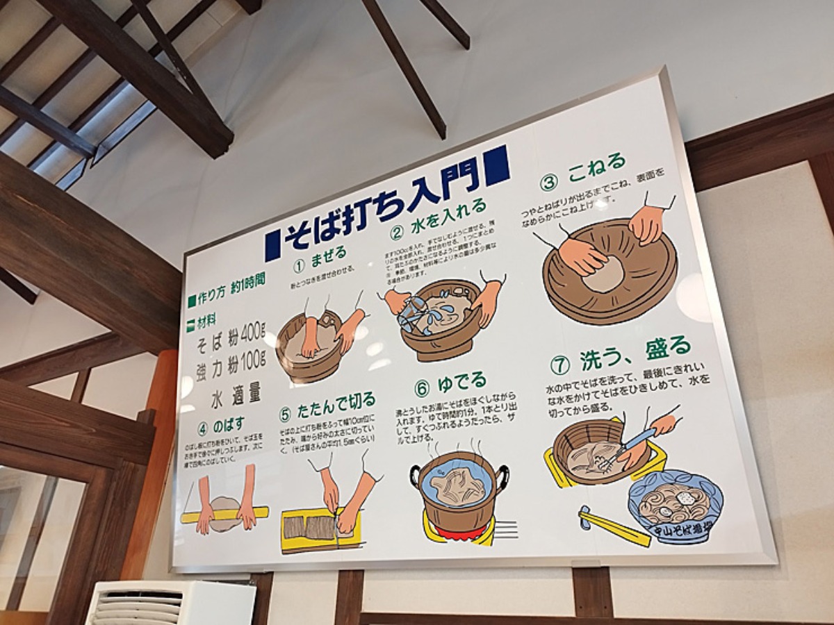 道場内にはそばの作り方が特大パネルで表示されていて分かりやすいです。