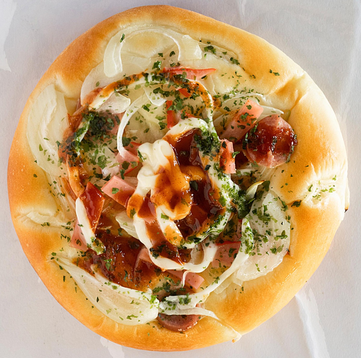 リピーターの多い惣菜パン。タマネギ、ハム、マヨネーズにオリジナルソースをかけ焼き上げている