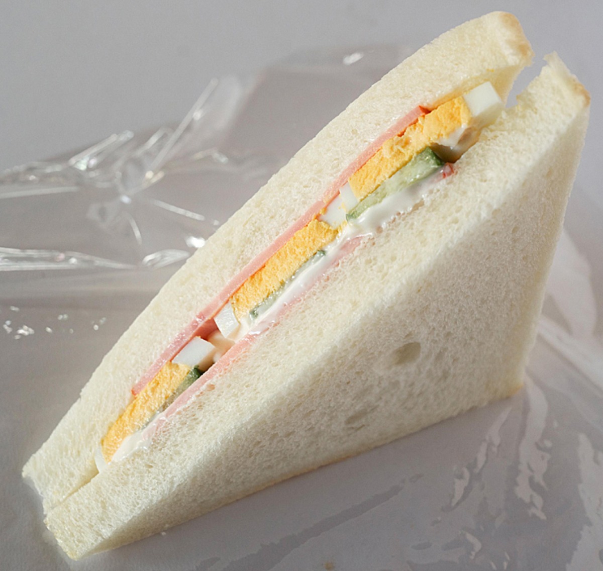 ハム、ゆで卵、キュウリ、マヨネーズを店自慢の食パンでサンドしたシンプルに美味しい一品
