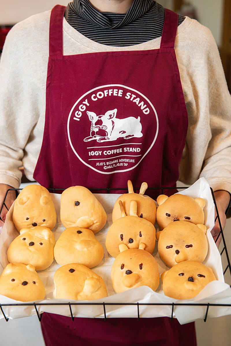 動物をかたどったパン。写真のくま(チョコクリーム)の他に、ことり(カスタードクリーム)、うさぎ(いちごジャム)などがある