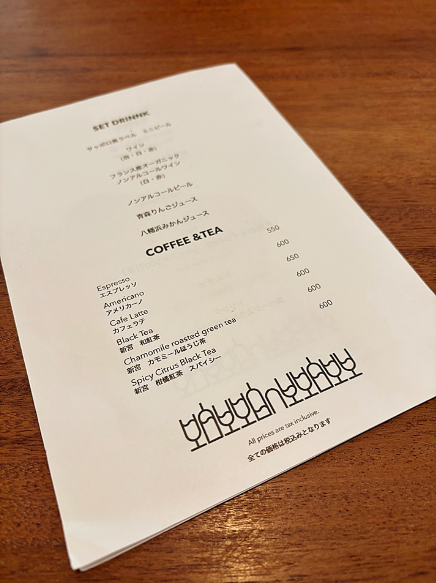 アルコールやソフトドリンクがあり、コーヒーや紅茶は追加料金がかかります。