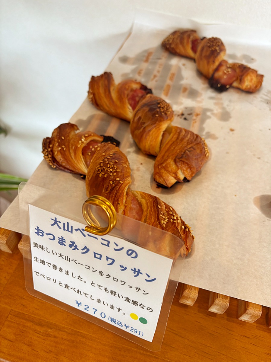 帰り際に焼きたてが出てきた「大山ベーコンのおつまみクロワッサン」(291円)です。