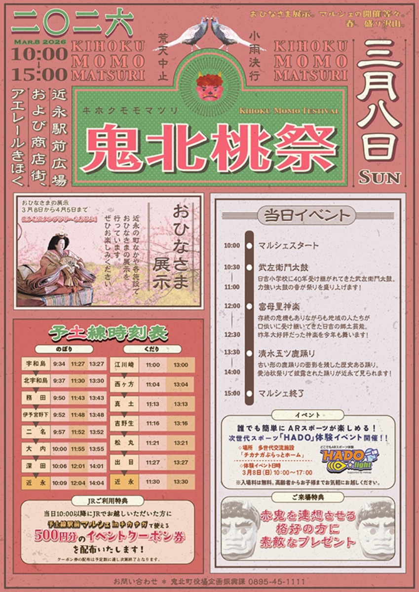 鬼北町では「鬼北桃祭」と連動した企画が展開され、春らしい桃の花や地元産品が並ぶほか、旬のグルメや特産品との出会いが待っています。