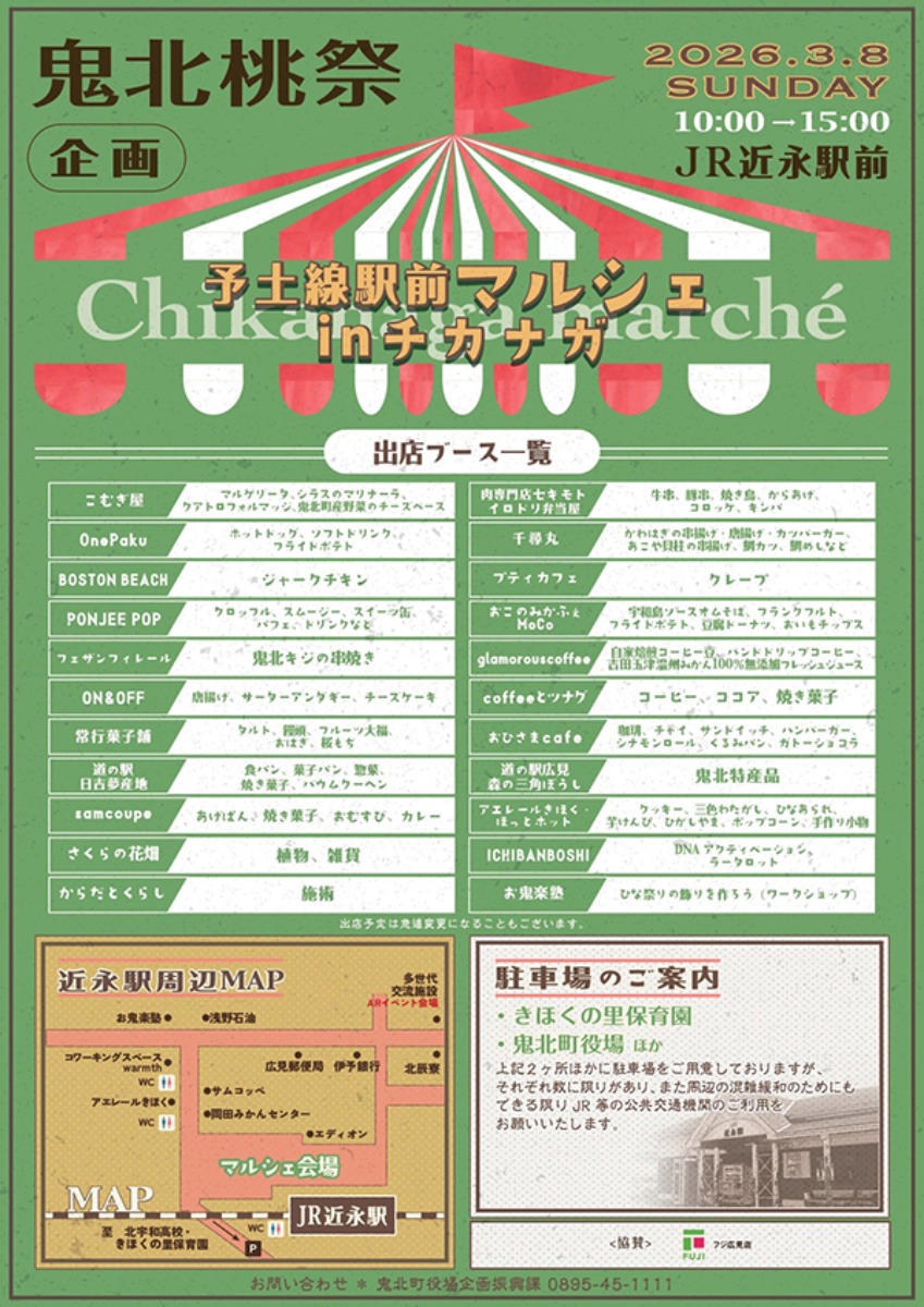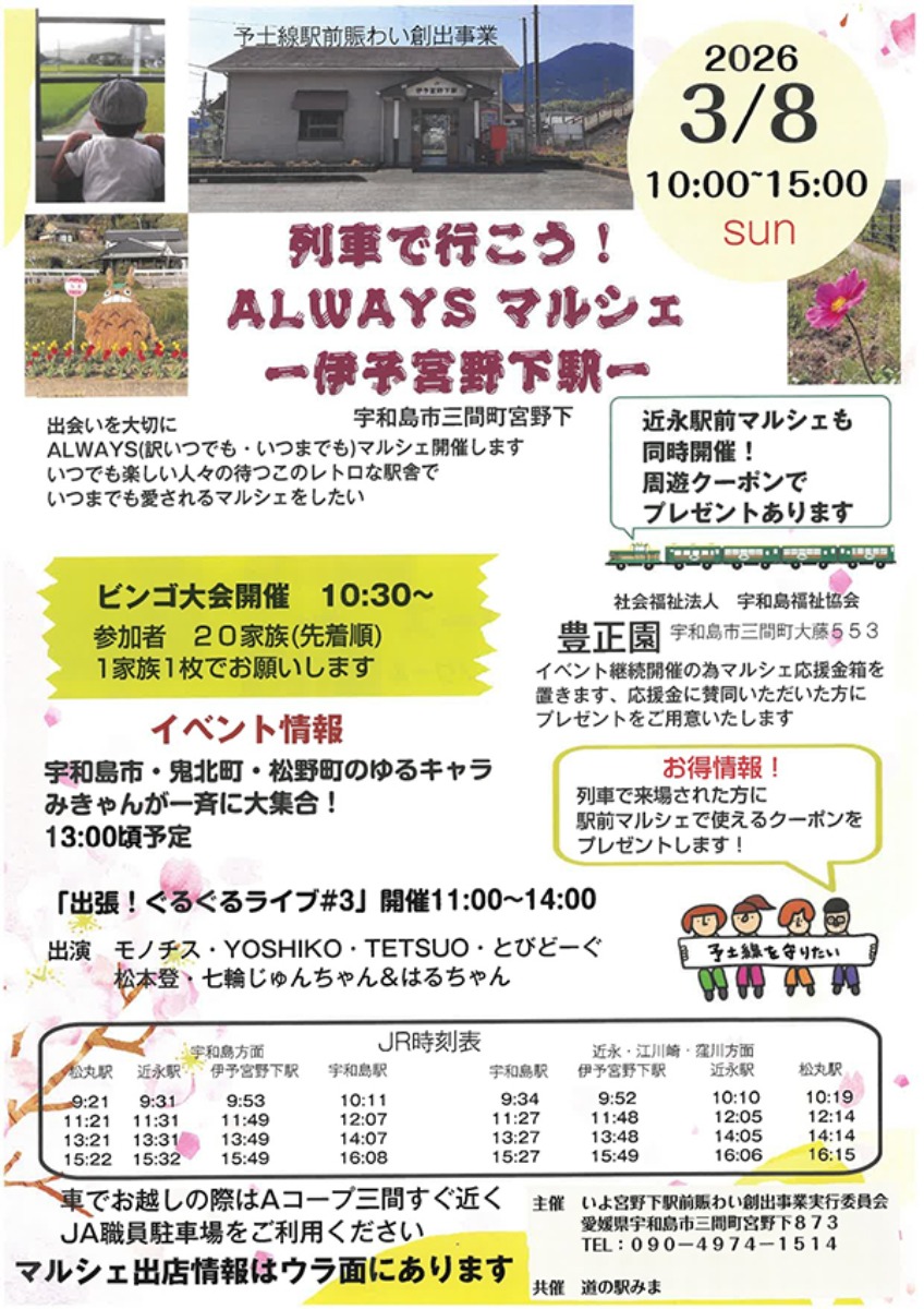 2026年3月8日(日)は、JR予土線の2つの駅前で「予土線駅前マルシェ in チカナガ」と「列車で行こう!ALWAYSマルシェ」が同時開催。