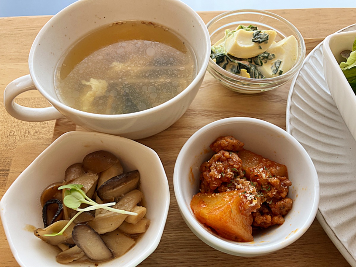 今週は、みそかつ、じゃがいものボロネーゼ風、きのこのピリ辛みそ、ほうれん草卵サラダ、大根ととり肉煮物、サラダ、スープでした。