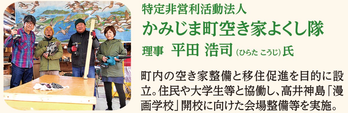 NPO・地域住民・大学・行政の4者連携で上島町内の空き家を再生し、移住希望者の住まいとして活用する取り組みを展開。