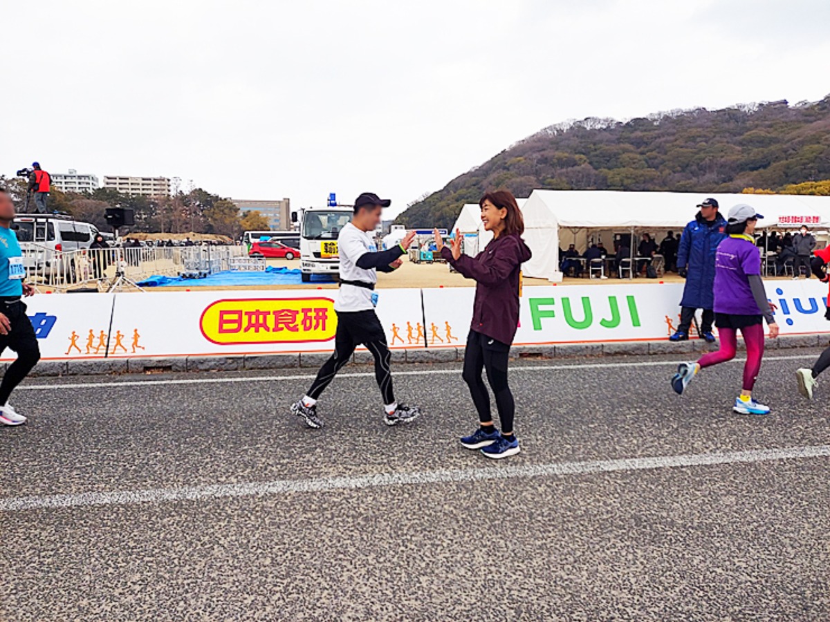 ここでは、高橋尚子さんがランナーの一人ひとりに手を伸ばし、ハイタッチで迎えていました。