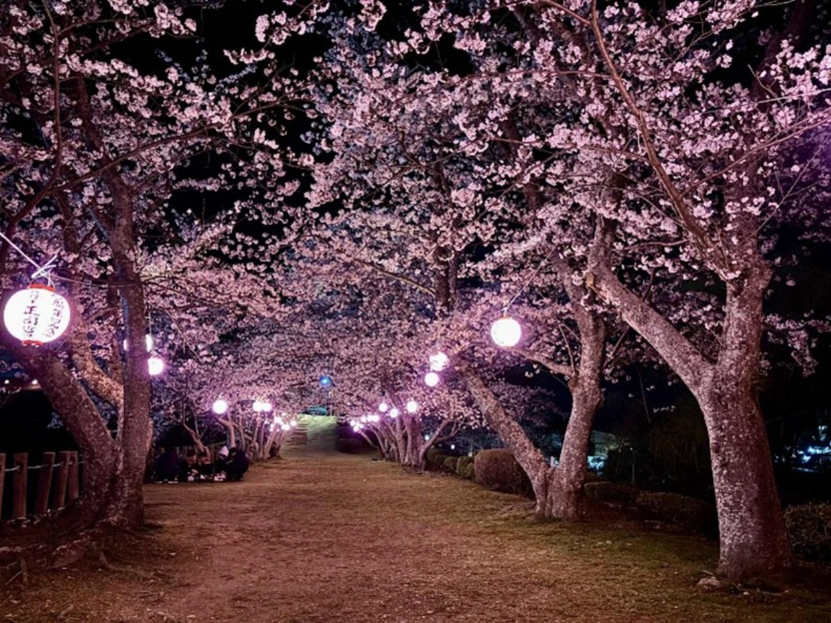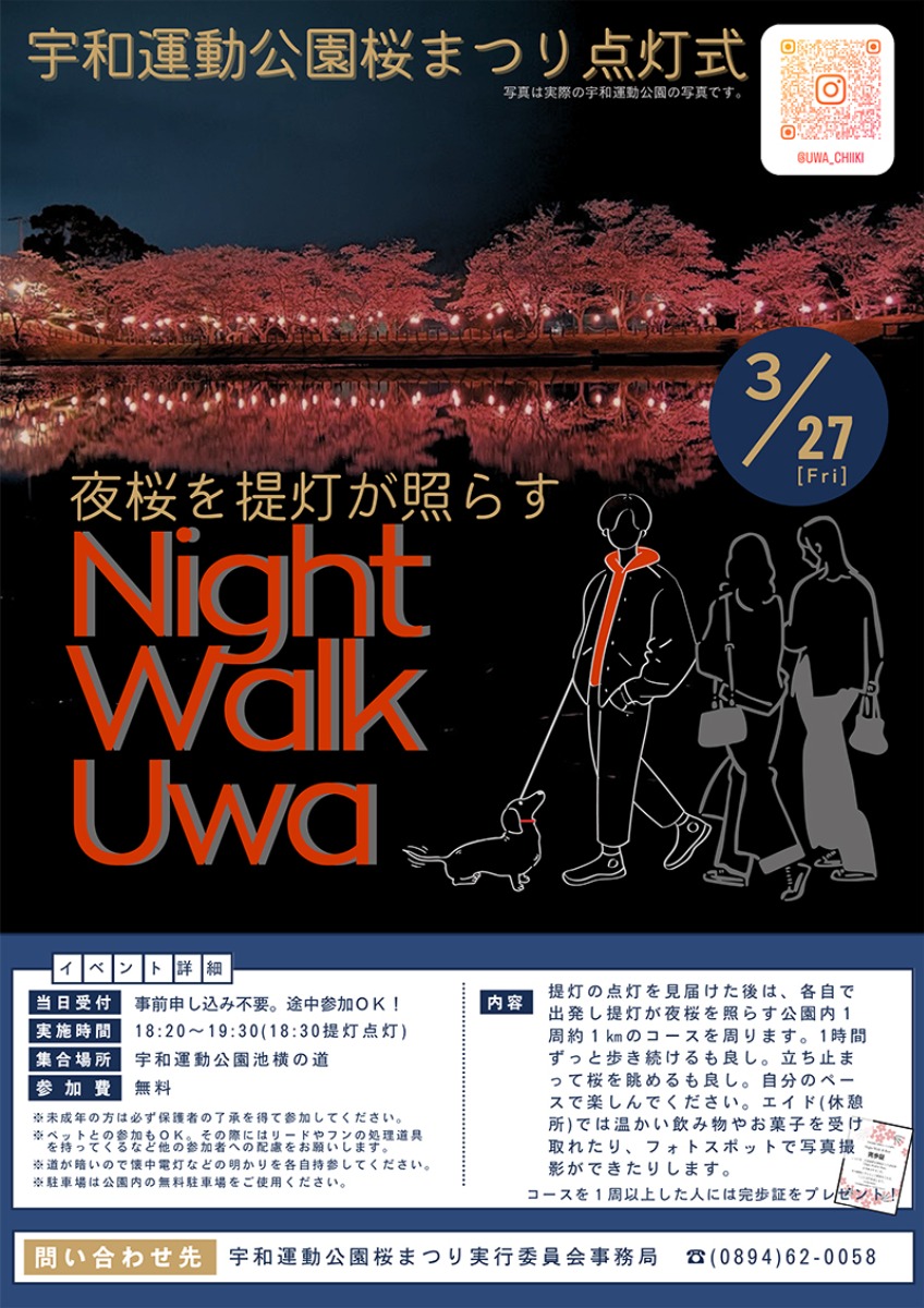 として「Night Walk Uwa」が行われます。提灯の点灯を見届けた後に、1周約1kmのコースを各々で歩きながら、桜を眺めて過ごします。