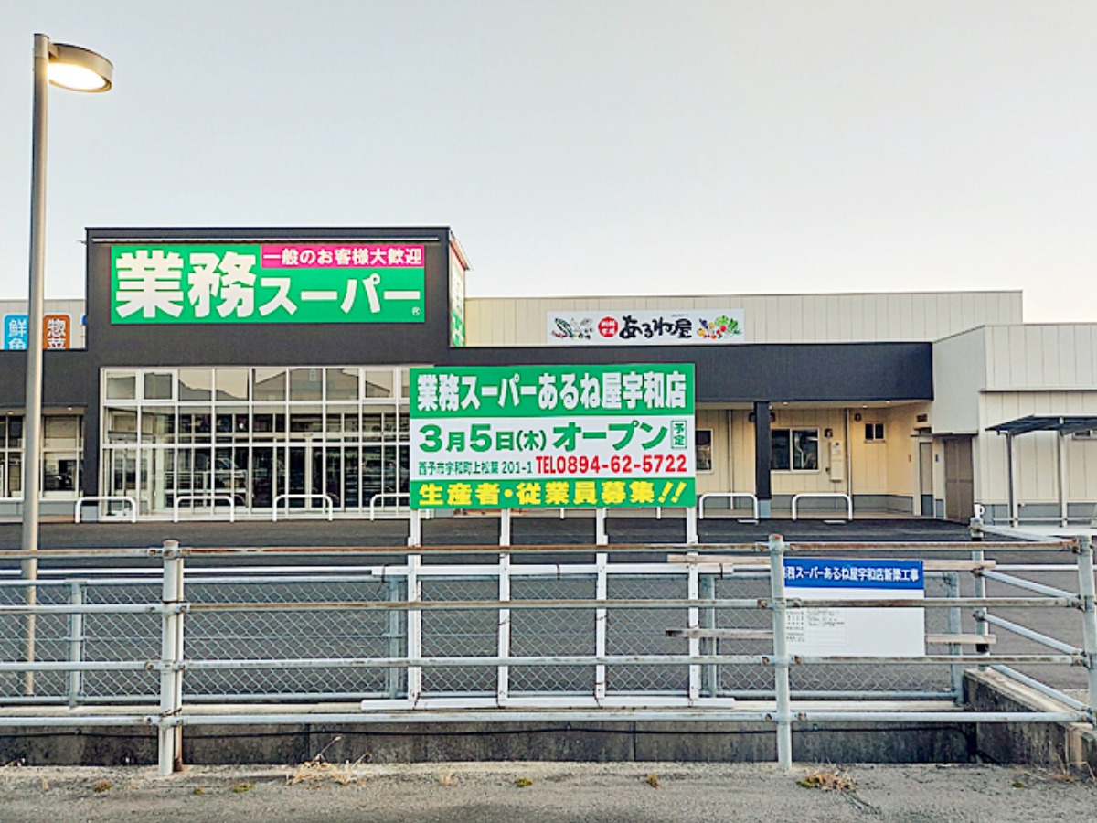 西予市宇和町にあるパーラーじゃんじゃん駐車場内に、「業務スーパーあるね屋宇和店」が新しくオープンするという情報を耳にしましたので、さっそく現地へ向かってみると、駐車場の一部に新しい建物が建っていました。