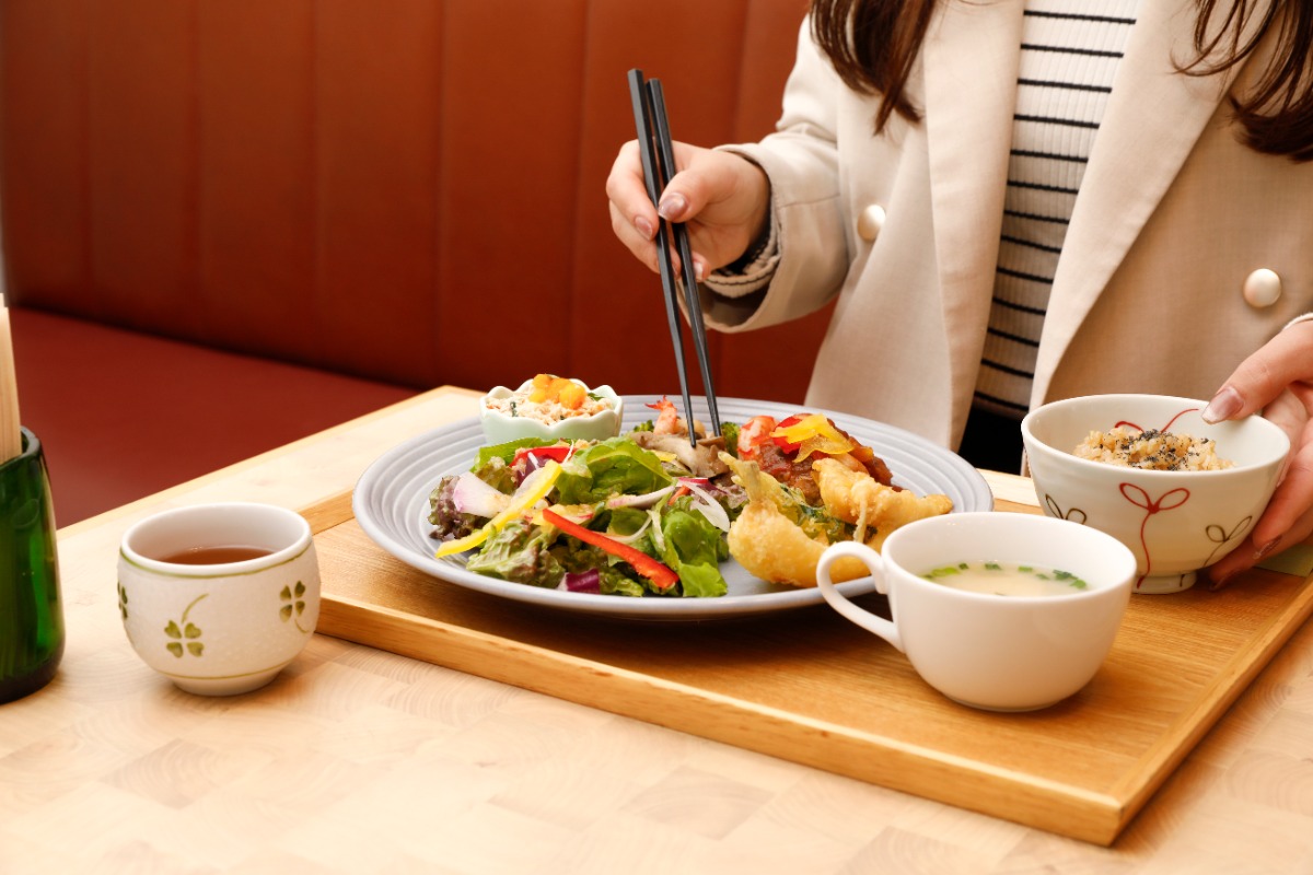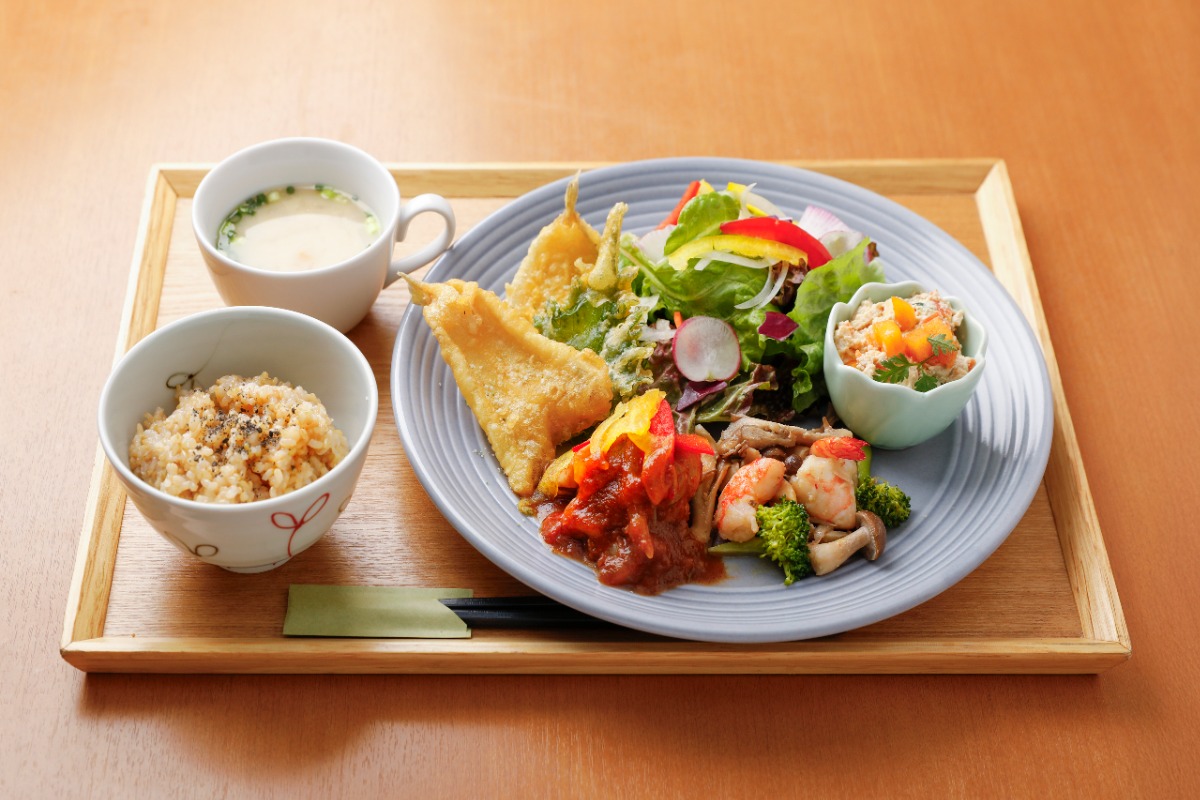 「ティア自然食堂」では、10種類の惣菜から選べる、有機野菜を使用した健康的な手作りランチを楽しむことができます。