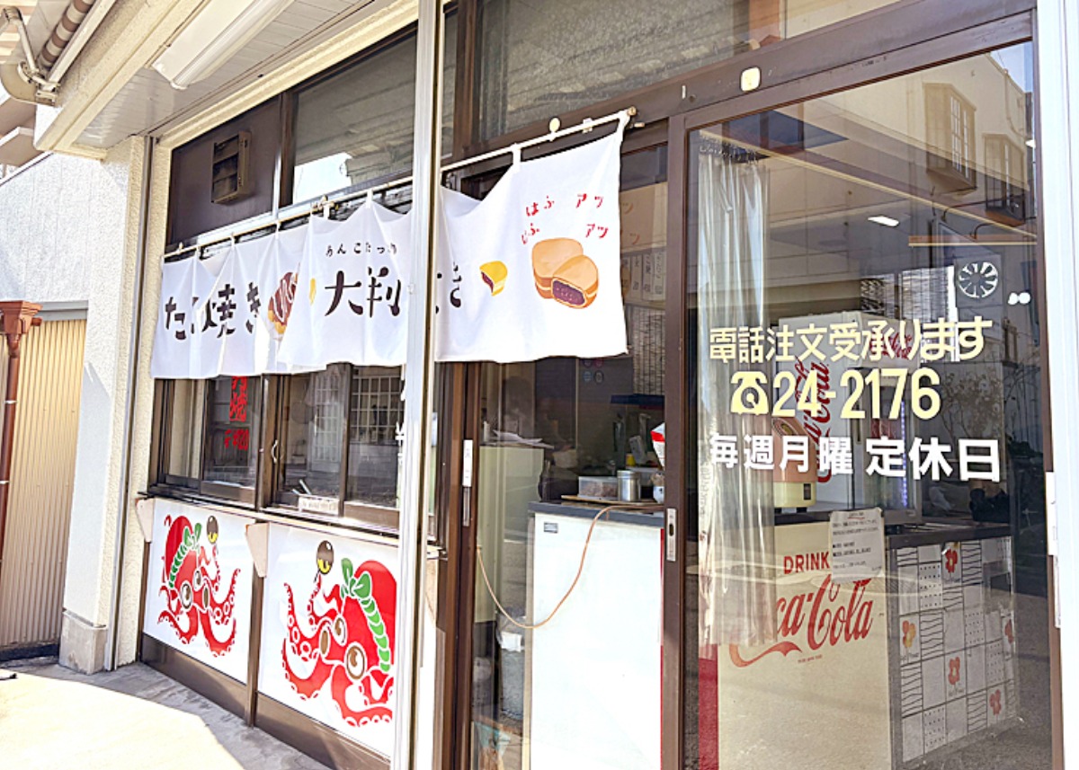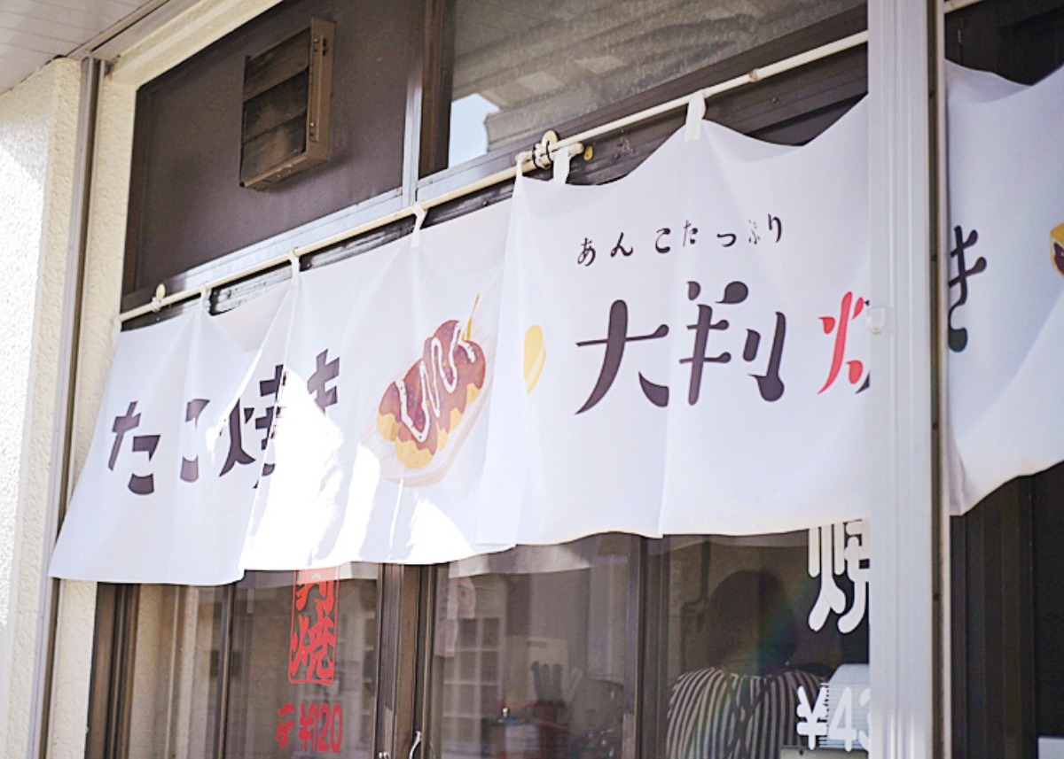 訪れると、かわいいタコのイラストがお出迎え。「たこ焼き、大判焼き」の文字が入った、白い暖簾が目を引きます。