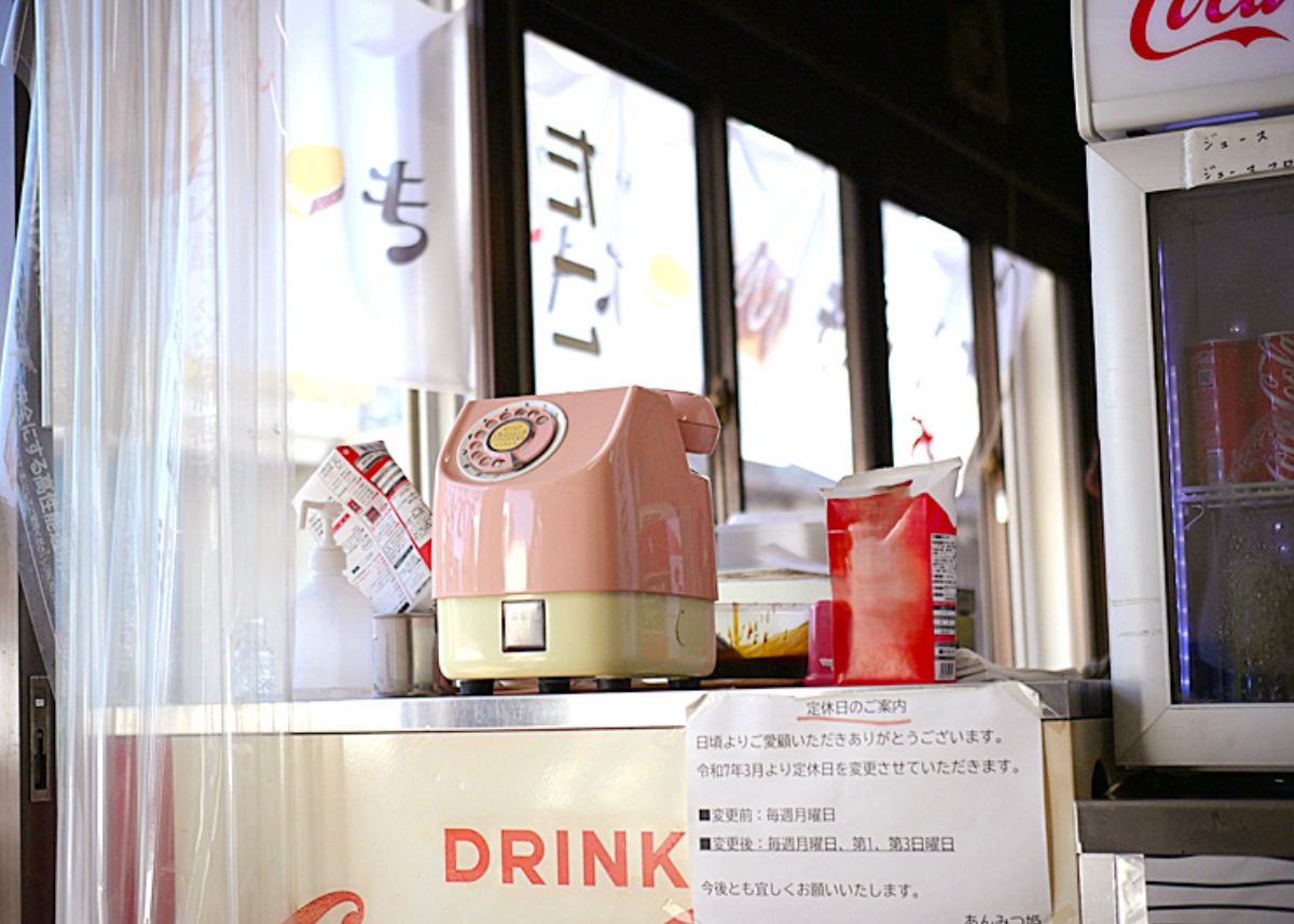 店内には、ピンクのダイヤル式電話をはじめ、懐かしいデザインのインテリアが並び、レトロな雰囲気が広がっています。