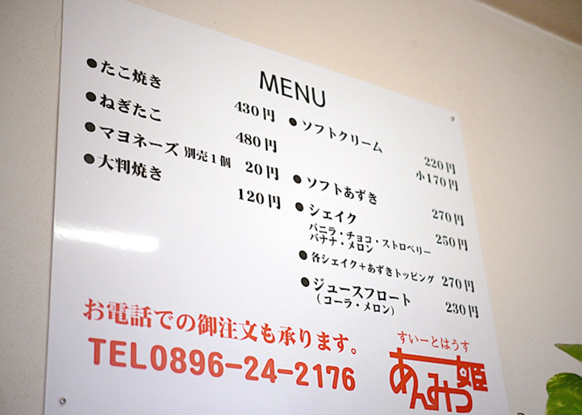 現在のメニューがこちら。「たこ焼き」や「大判焼き」はもちろん、「ソフトクリーム」や「シェイク」も人気です!