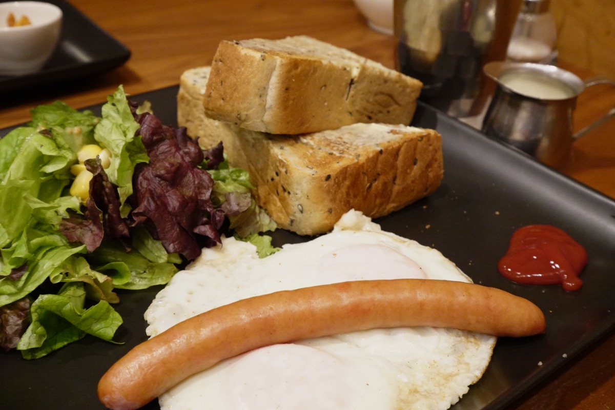 ソーセージ・目玉焼き・サラダ・厚切りトーストがセットになった「ルパンセット」は、ドリンク価格に+420円で注文可能です。