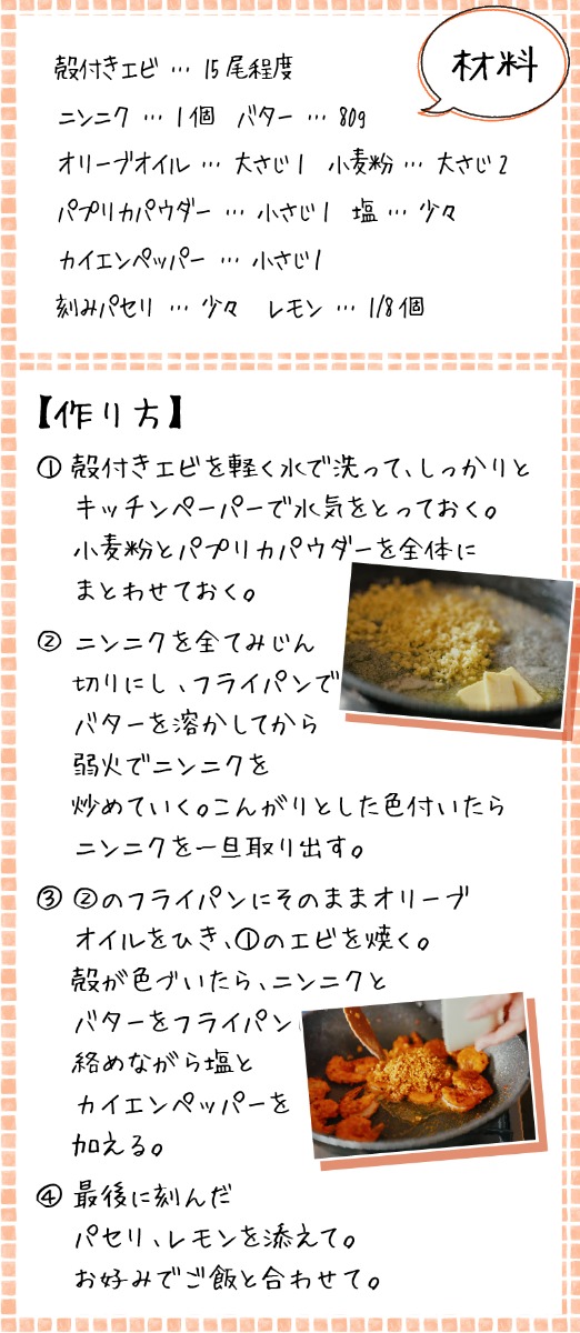 エビの殻もサクサク!たっぷりのバターの甘味とスナックのようなニンニクがしっかりエビの旨味と合わさり、止まらない美味しさになります。元気を出したい時のスタミナ飯としてもおすすめ!