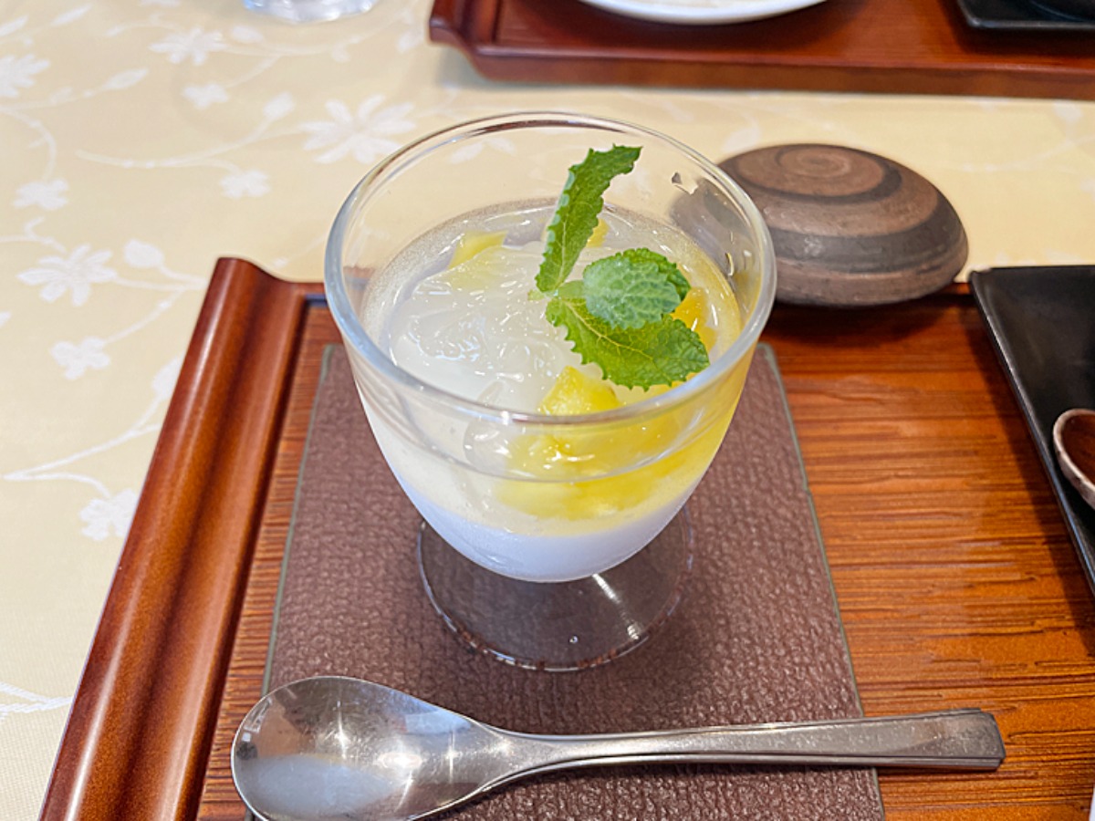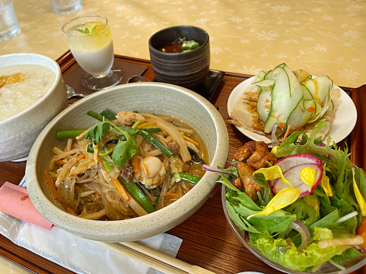ランチには必ずセットが付き、ミニ雲白肉(ウンパイロウ)、ライスまたは中華粥、中華風茶わん蒸し、胡桃と周桑野菜のサラダ、白キクラゲ入り杏仁豆腐と内容も充実。