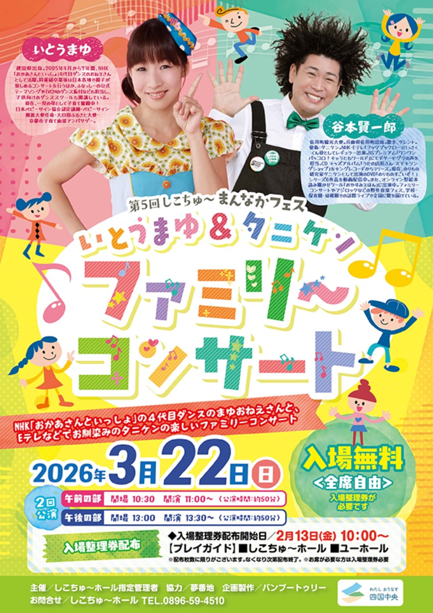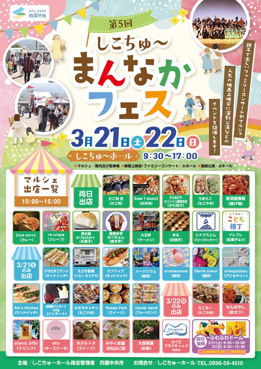 四国中央市のしこちゅ~ホールを舞台に、春の訪れをみんなで満喫できる「しこちゅ~まんなかフェス」が2026年3月21日・22日の2日間にわたり開催されます。