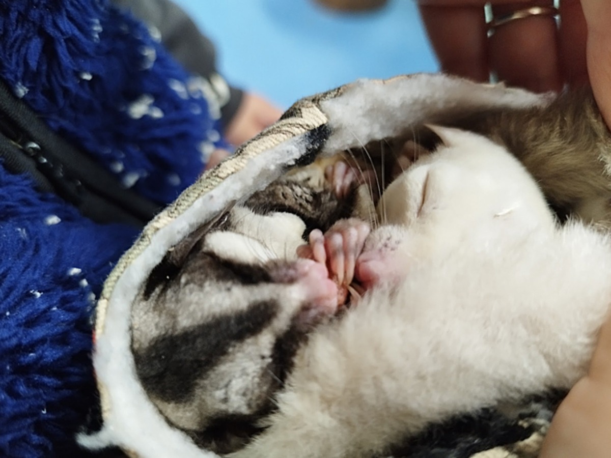 店員さんがそっと渡してくれた巾着袋をのぞくと、フクロモモンガが2匹、仲睦まじくくるまっているではありませんか!