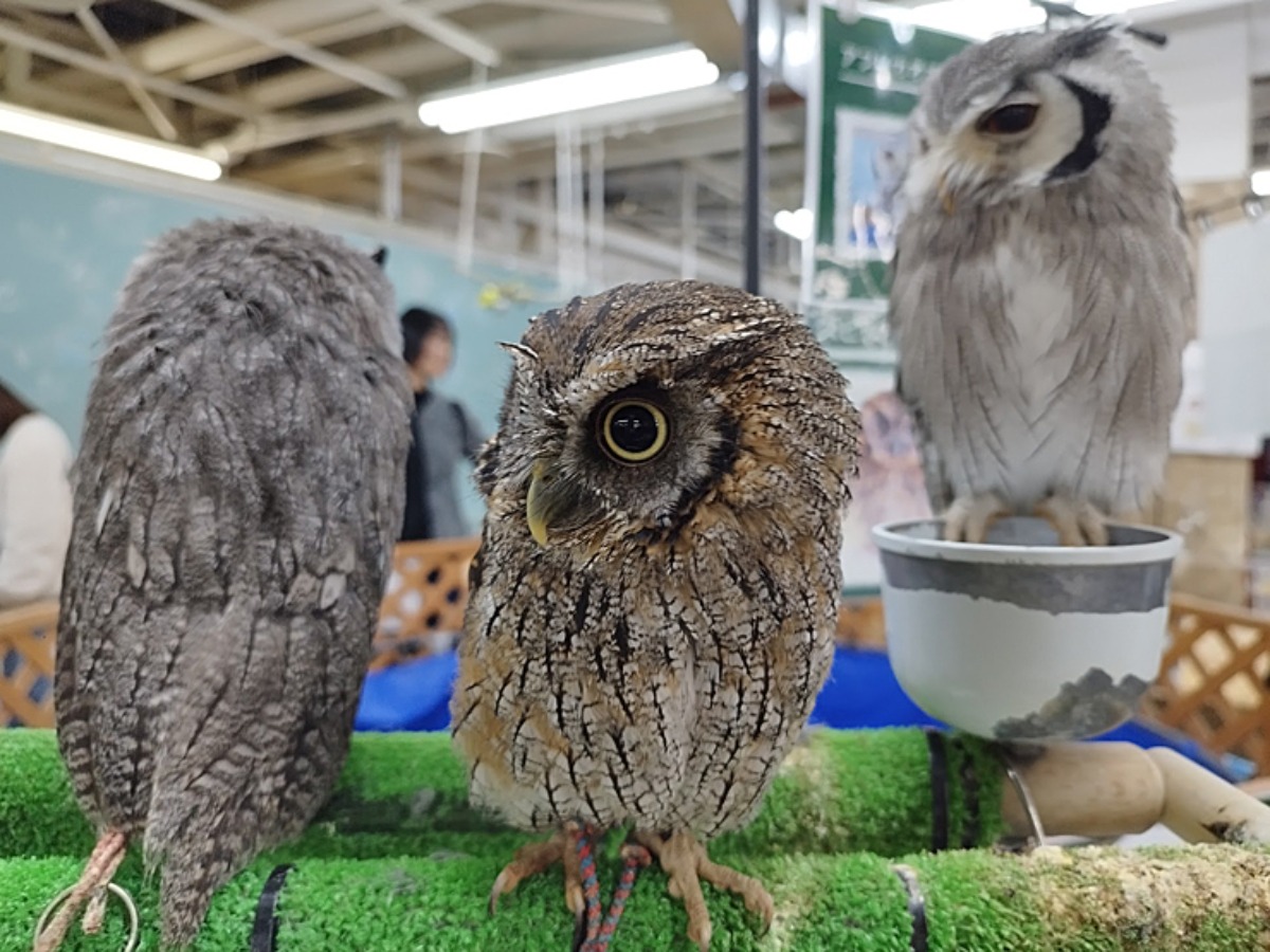 場内に入ると、まず目に飛び込んできたのは3匹のフクロウ。至近距離でその姿を楽しむことができました。