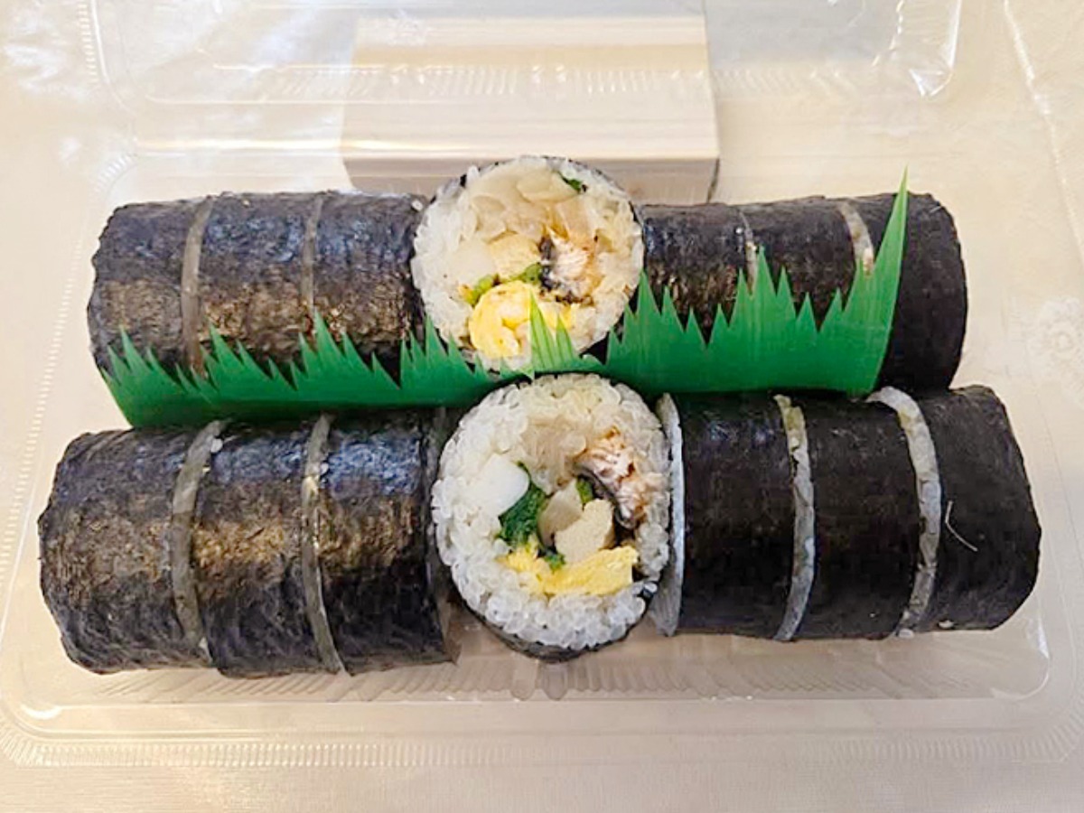 看板メニューの「鰻入り巻きずし」(1本1,000円)は、香ばしく焼き上げた鰻を中心に、三つ葉や高野豆腐、玉子などをバランスよく組み合わせた一品です。
