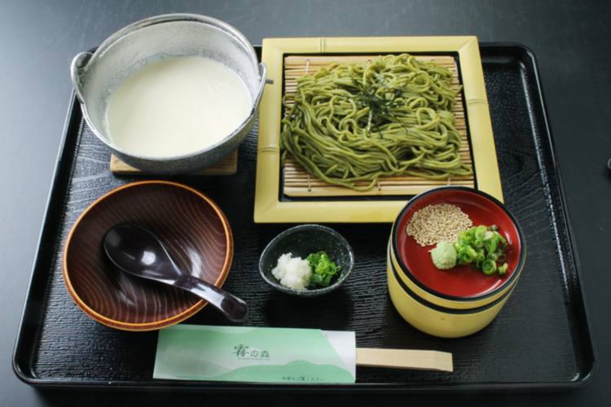 道の駅霧の森にある「霧の森レストラン」の一番人気は、新宮茶を贅沢に練りこんだ「霧の森茶そば」。