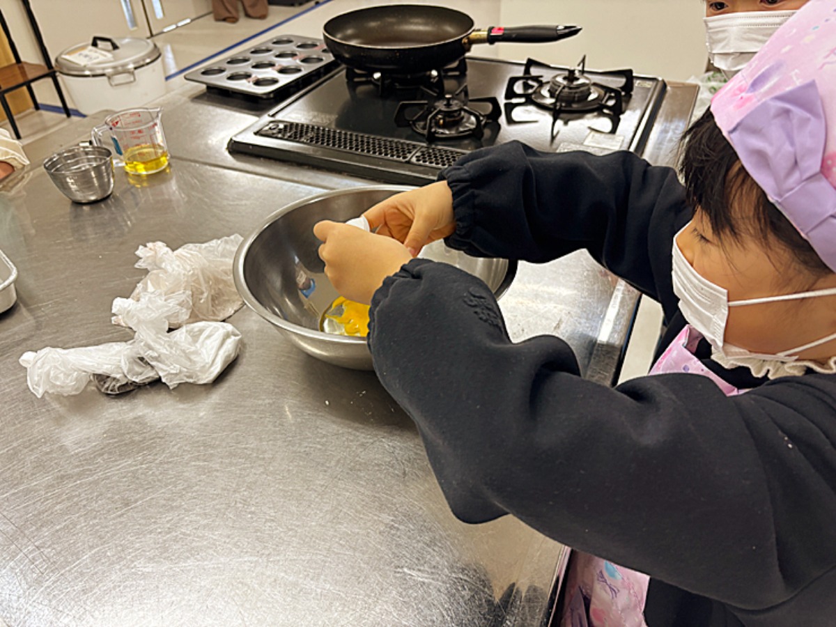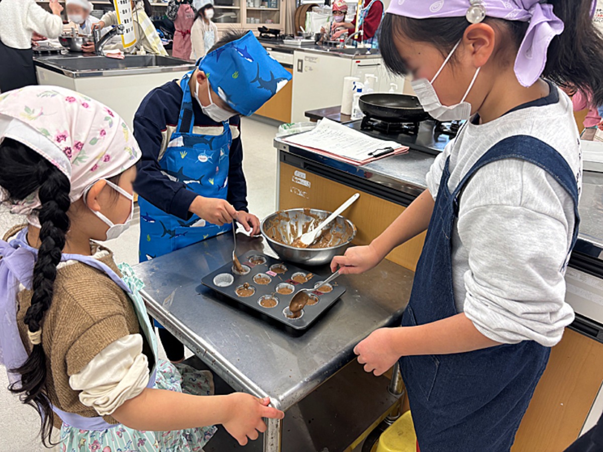 低学年の子どもたちにとっては少し難しい作業。最初は苦戦しながらも、スプーンを使って一つひとつ丁寧に生地を入れていきます。