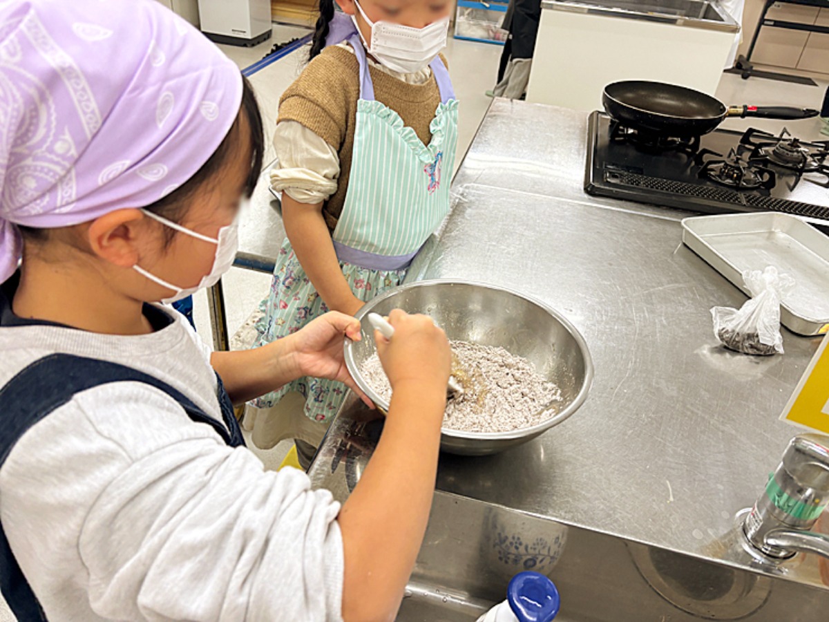 白い粉が見えなくなるように、ヘラを使ってあっちもこっちもまぜまぜ。「どうやったら混ざる?」と、首をかしげる子どもたちの姿も見られました。