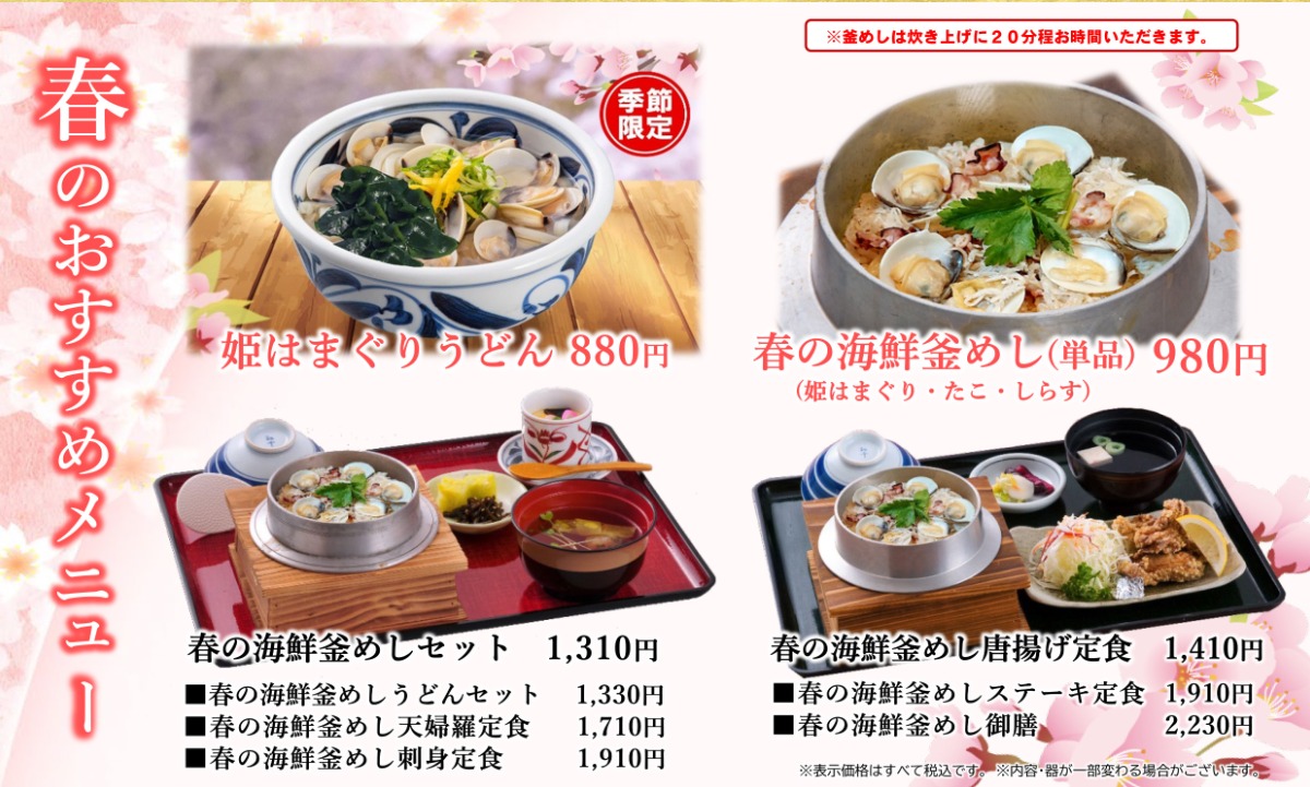 季節限定の「姫はまぐりうどん」や、「春の海鮮釜めし」など旬の食材を使用したメニューをお楽しみいただけます。