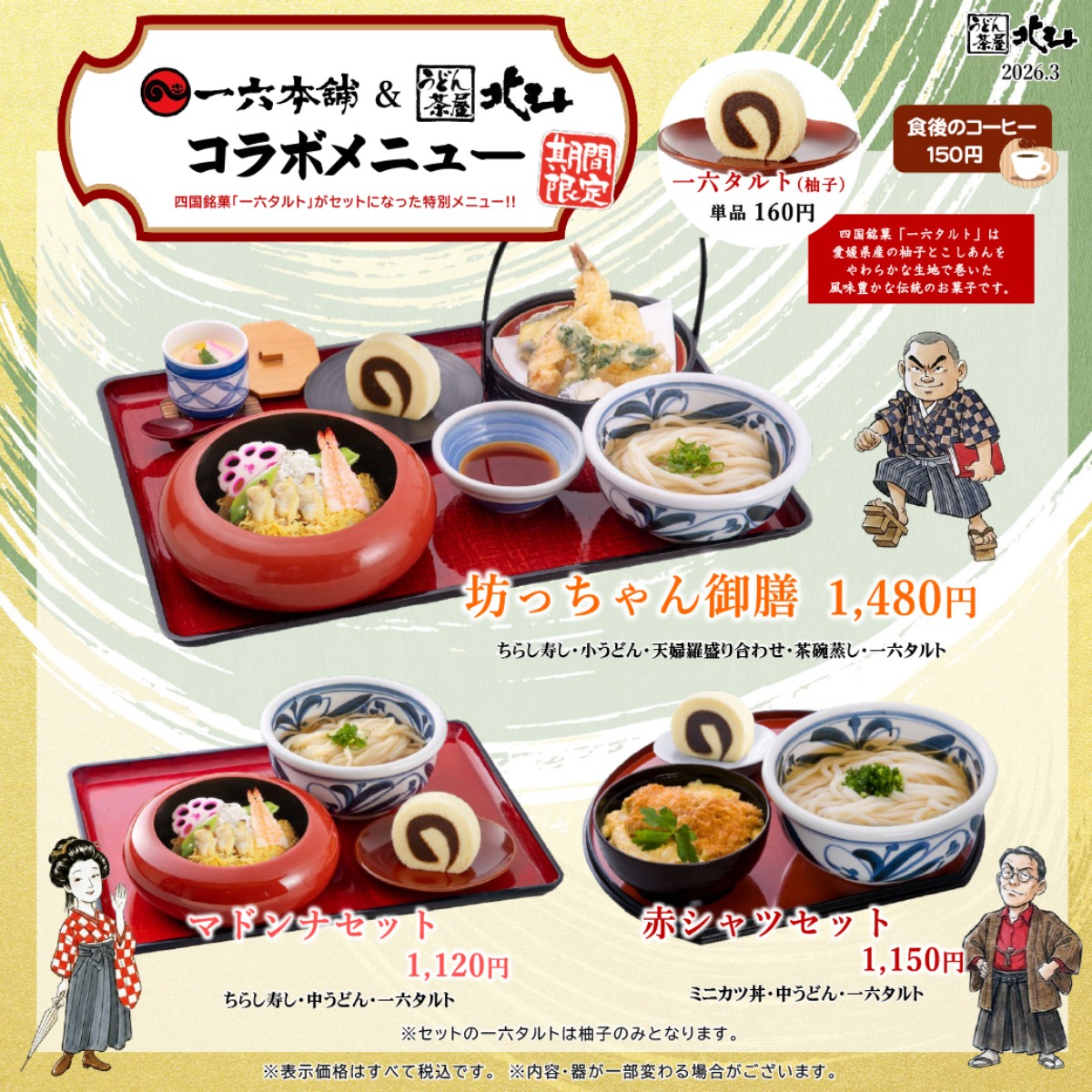 うどん茶屋北斗各店にて、一六本舗・うどん茶屋北斗のコラボメニューを期間限定にて実施中!