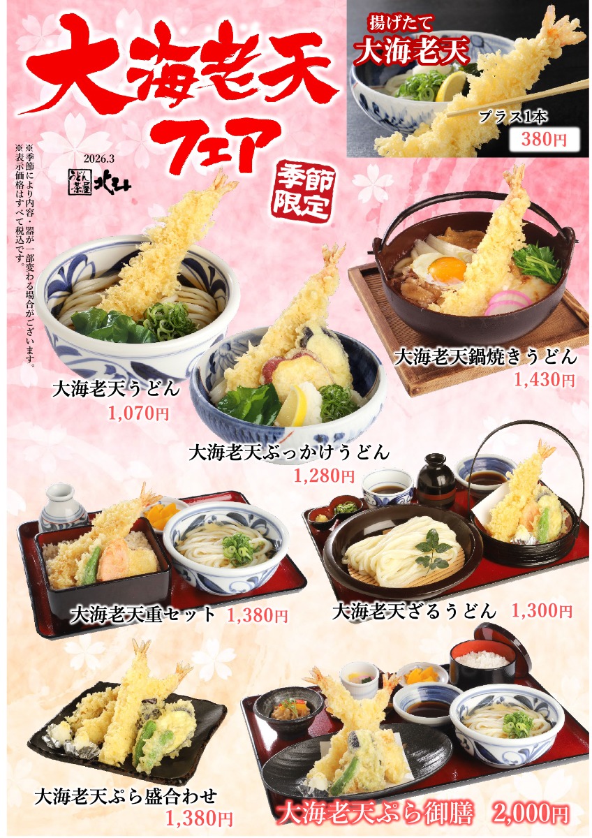 揚げたての大海老天をおうどんや天重でお召し上がりくださいませ。