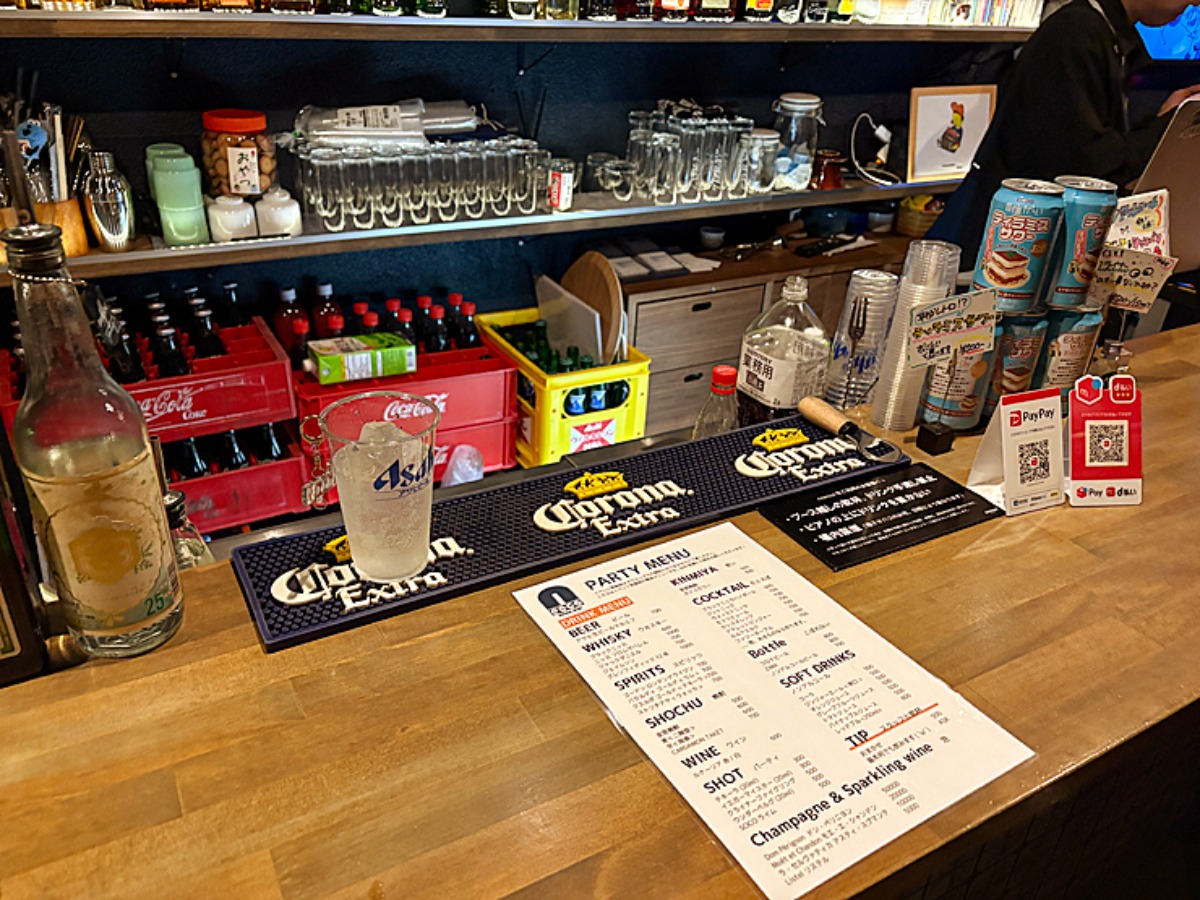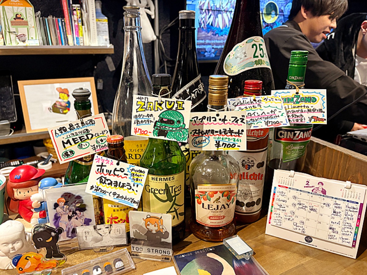 店員さんの書いたポップが目を引く限定ボトルたち。お客さんやDJさんから送られたアクリルスタンドなどごちゃごちゃ楽しいカウンターの隅っこ。