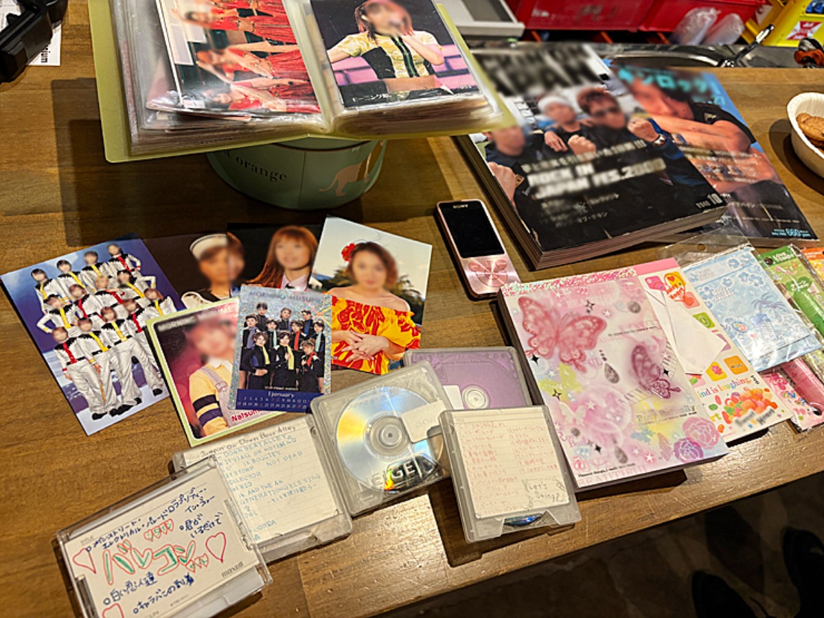 アイドル生写真にMD、ポータブル音楽プレイヤーにパカパカのガラケー、あの頃のロック情報誌。MDやチェキはめちゃくちゃデコられてて当時の女の子達が持ってた底抜けの元気さを思い出します。