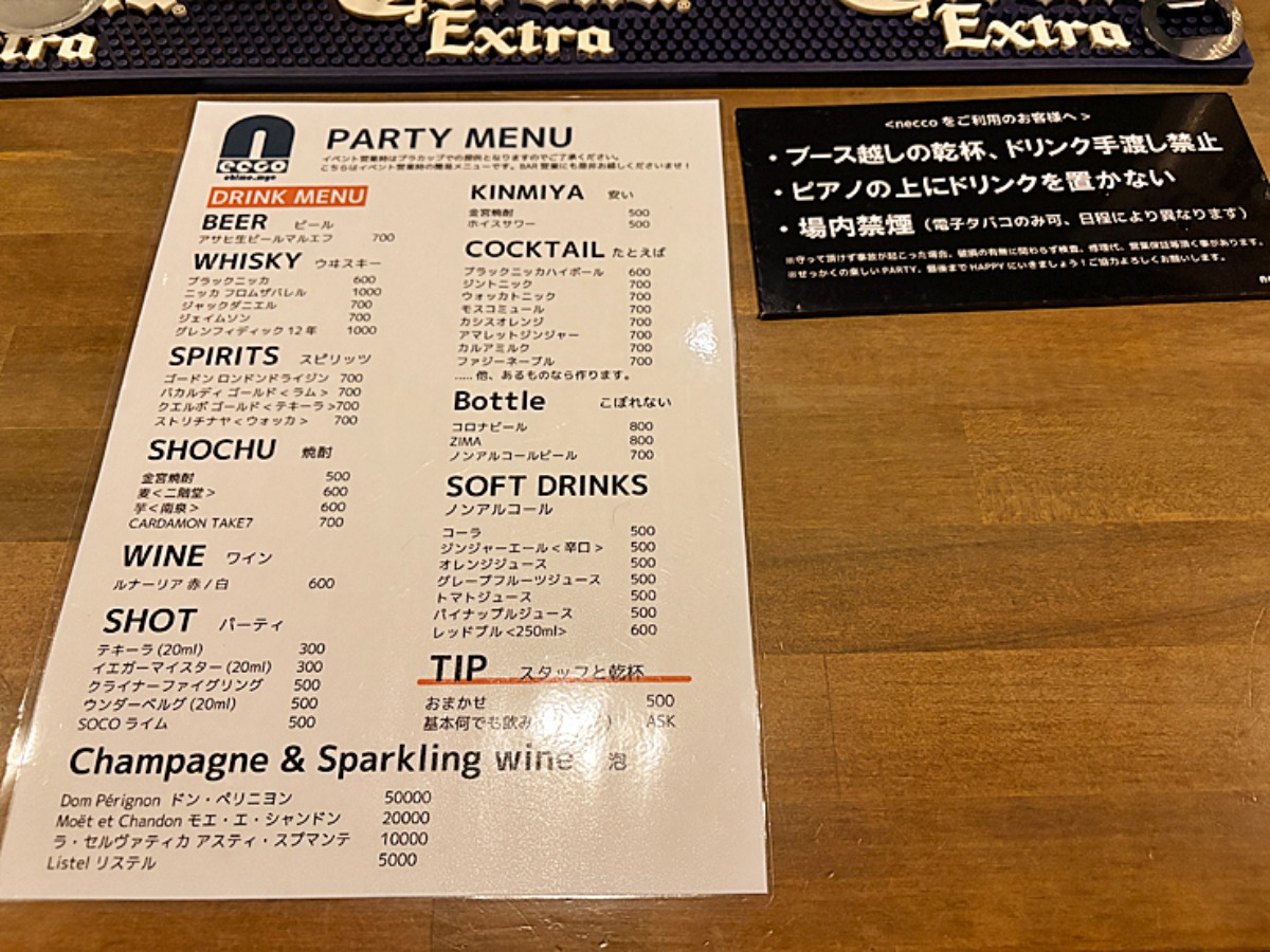 イベント時のメニュー表。ソフトドリンクも充実、メニューに記載のない飲み物もあったりします。