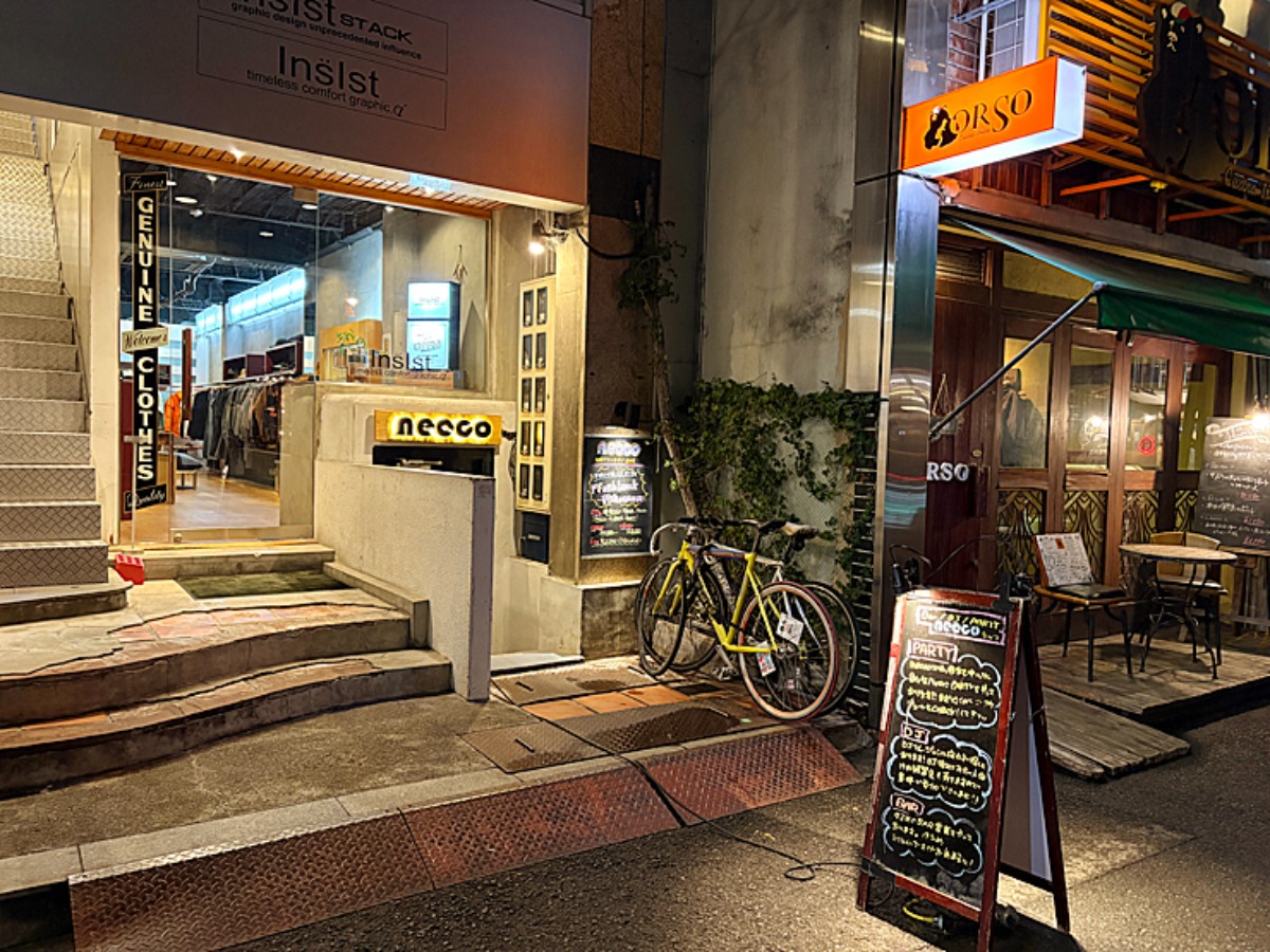 大街道からちょっと脇道に入ると見えてくるおしゃれな一角、その地下に「BAR necco」はあります。