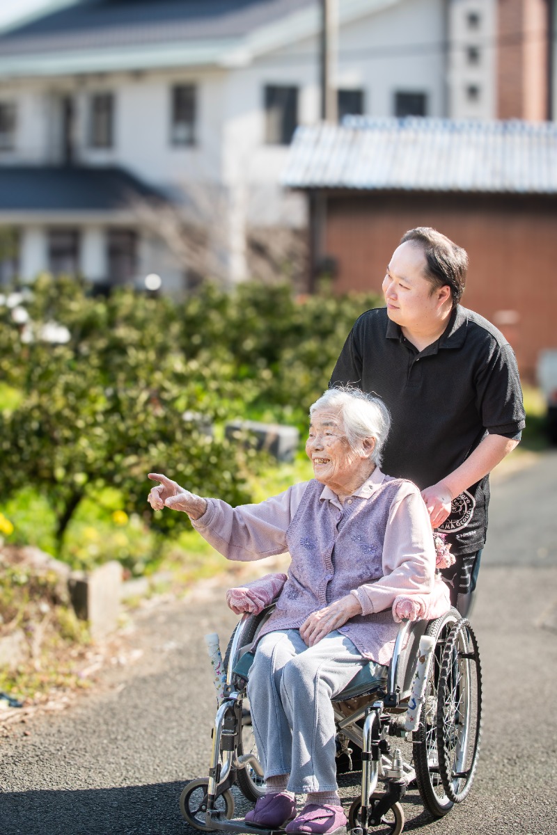 介護の現場では、利用者一人ひとりとの対話を大切にし、地元出身ならではの親しみやすさで信頼関係を築くことを大切にしている。